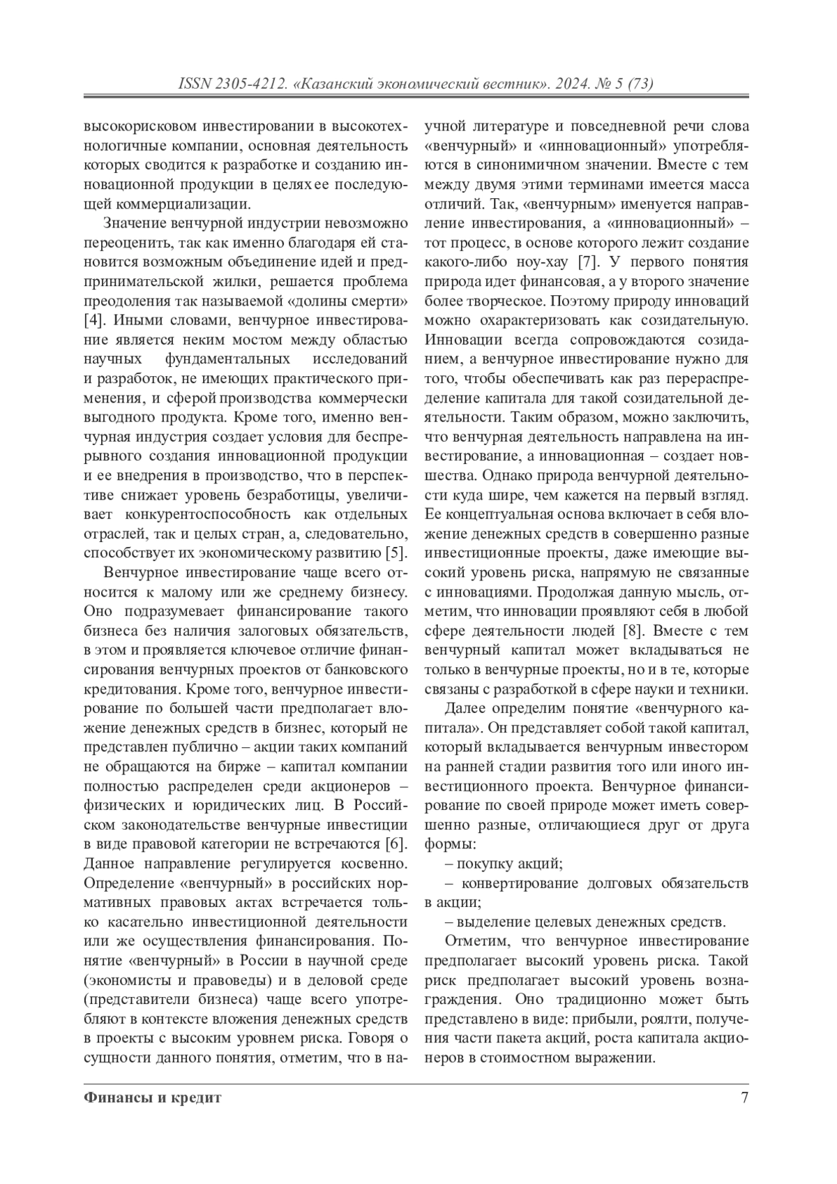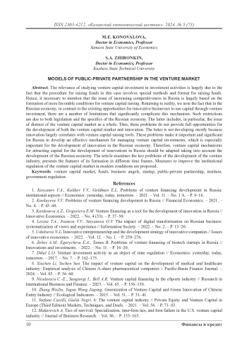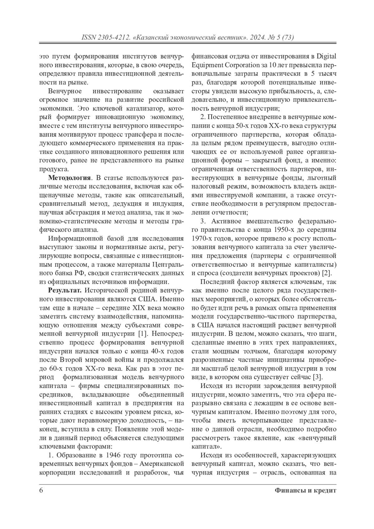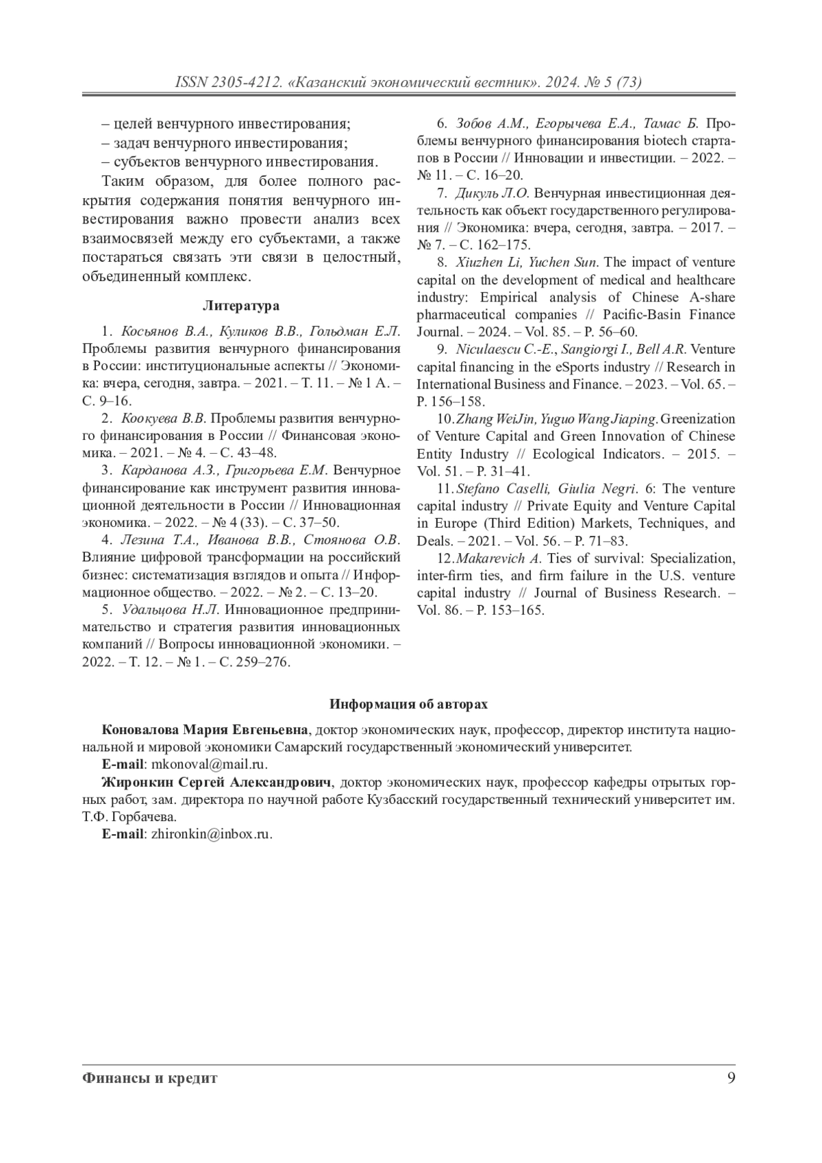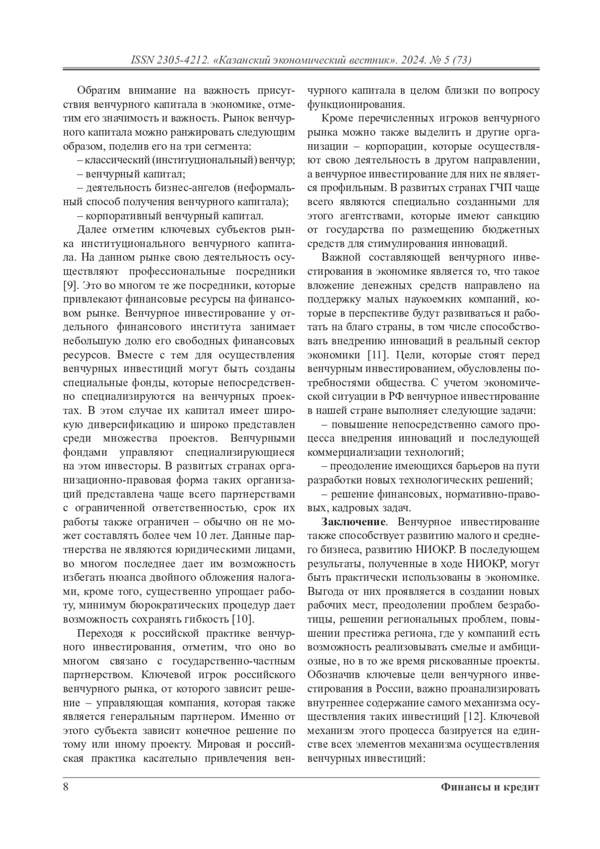 Актуальность изучения венчурного инвестирования инвестиционной деятельности во многом обусловлена тем, что порядок привлечения денежных средств в данном случае предполагает специальные способы и формат привлечения денежных средств. Здесь важно упомянуть, что вопрос повышения конкурентоспособности в России во многом строится на формировании более благоприятных условий для венчурного привлечения капитала. Возвращаясь к реальности, отметим тот факт, что в российской экономике в противовес имеющимся возможностям применения инновационным бизнесом капитала посредством венчурного инвестирования имеется ряд ограничений, существенно затрудняющих этот механизм. Такие ограничения обусловлены как законодательством, так и особенностями экономики России. К последнему относится в частности вопрос недоверия к венчурному рынку в целом. Таким образом, обозначенные проблемы не дают в полной мере возможностей для развития как венчурного рынка, так и инноваций. Последнее не развивается в значительной степени потому, что инновации во многом коррелируют с венчурными инструментами привлечения капитала. Приведенные проблемы делают значимым процесс появления в России действенного механизма управления венчурным инвестированием, особенно это важно для развития инновационной деятельности в экономике России. Поэтому венчурные механизмы привлечения капитала для развития в России инноваций должны быть адаптированы с учетом развития российской экономики. В статье рассмотрены ключевые проблемы развития венчурной индустрии, представлены особенности ее формирования в различных временных рамках. Предложены меры по совершенствованию институционального регулирования венчурного рынка в современных условиях.