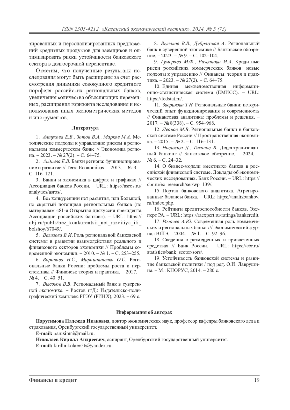 8. Высоков В.В., Дубровская А. Региональный банк в суверенной экономике // Банковское обозрение. - 2023. - № 9. - С. 102-104.