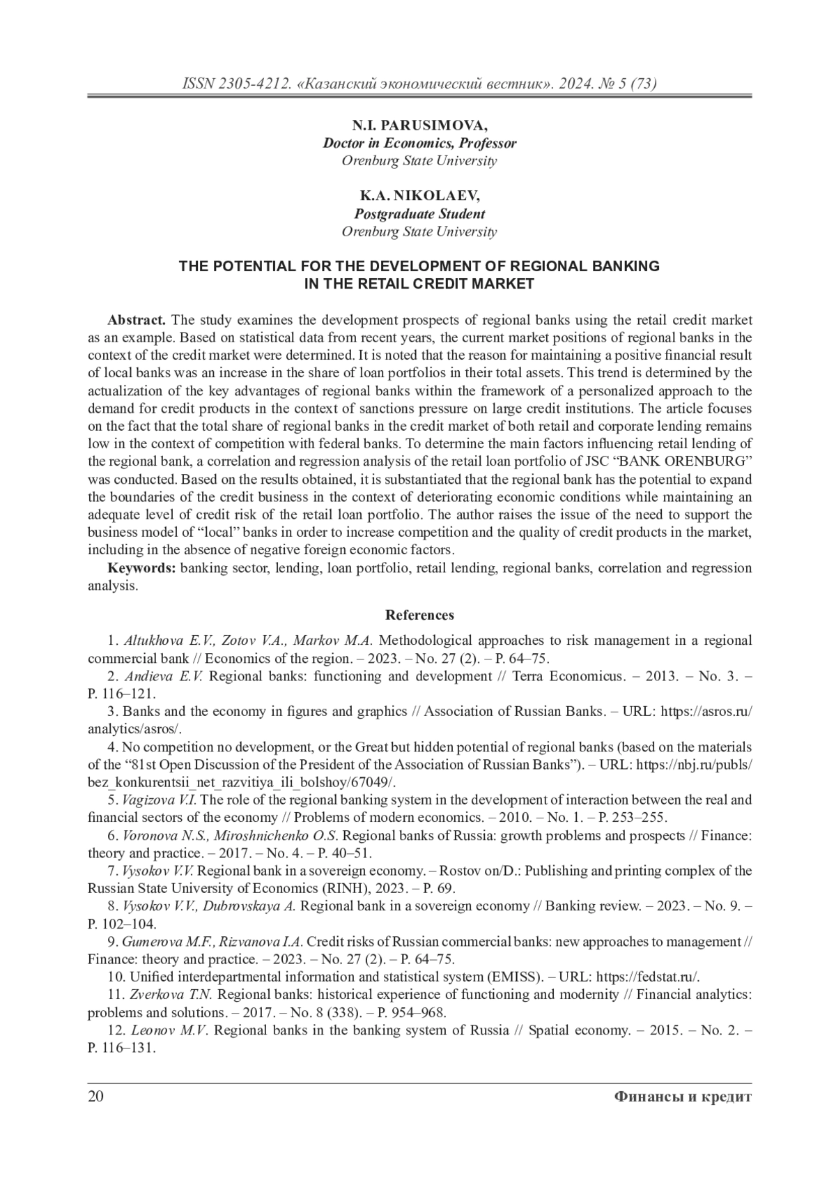 В исследовании рассмотрены перспективы развития региональных банков на примере розничного кредитного рынка. На основе статистических данных последних лет определены текущие рыночные позиции региональных банков в контексте кредитного рынка. Отмечается, что причиной сохранения положительного финансового результата локальных банков выступило увеличение доли кредитных портфелей в их совокупных активах. Данная тенденция определяется актуализацией ключевых преимуществ региональных банков в рамках персонализированного подхода к спросу на кредитные продукты в условиях санкционного давления на крупные кредитные организации. В статье акцентируется внимание на том, что общая доля региональных банков на кредитном рынке как розничного, так и корпоративного кредитования остается низкой в условиях конкуренции с федеральными банками. Для определения основных факторов, влияющих на розничное кредитование регионального банка, был проведен корреляционно-регрессионный анализ розничного кредитного портфеля АО «БАНК ОРЕНБУРГ». На основе полученных результатов обосновывается, что региональный банк имеет потенциальную возможность расширять границы кредитного бизнеса в условиях ухудшения экономической конъюнктуры при сохранении адекватного уровня кредитного риска розничного кредитного портфеля. Автором поднимается проблема необходимости поддержки бизнес-модели «местных» банков в целях повышения конкуренции и качества кредитных продуктов на рынке, в том числе в условиях отсутствия негативных внешнеэкономических факторов.