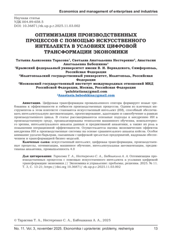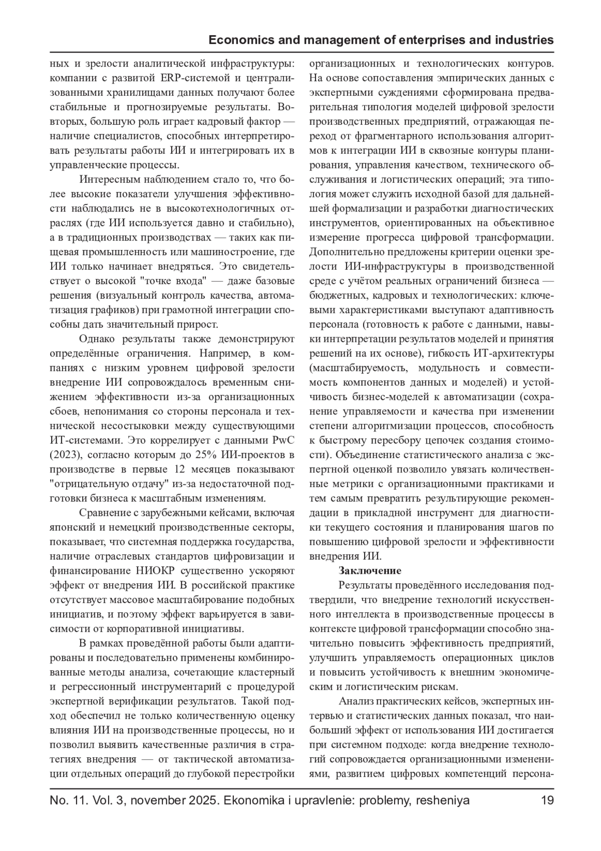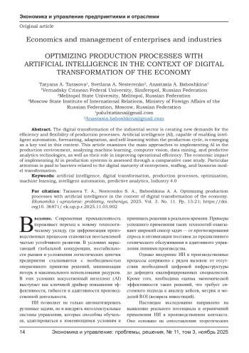 Цифровая трансформация промышленного сектора формирует новые требования к эффективности и гибкости производственных процессов. Одним из ключевых инструментов в этом контексте становится искусственный интеллект (ИИ), способный обеспечивать интеллектуальную автоматизацию, прогнозирование, адаптацию и самообучение в рамках производственного цикла. В статье рассматриваются основные подходы к внедрению ИИ в производственную среду, проанализированы технологии машинного обучения, компьютерного зрения, интеллектуального анализа данных и предиктивной аналитики, а также их роль в повышении операционной эффективности. Осуществляется оценка экономических эффектов внедрения ИИ в производственные системы на основе сравнительного анализа кейсов. Особое внимание уделено барьерам, связанным с цифровой зрелостью предприятий, кадровым обеспечением и трансформацией бизнес-моделей.