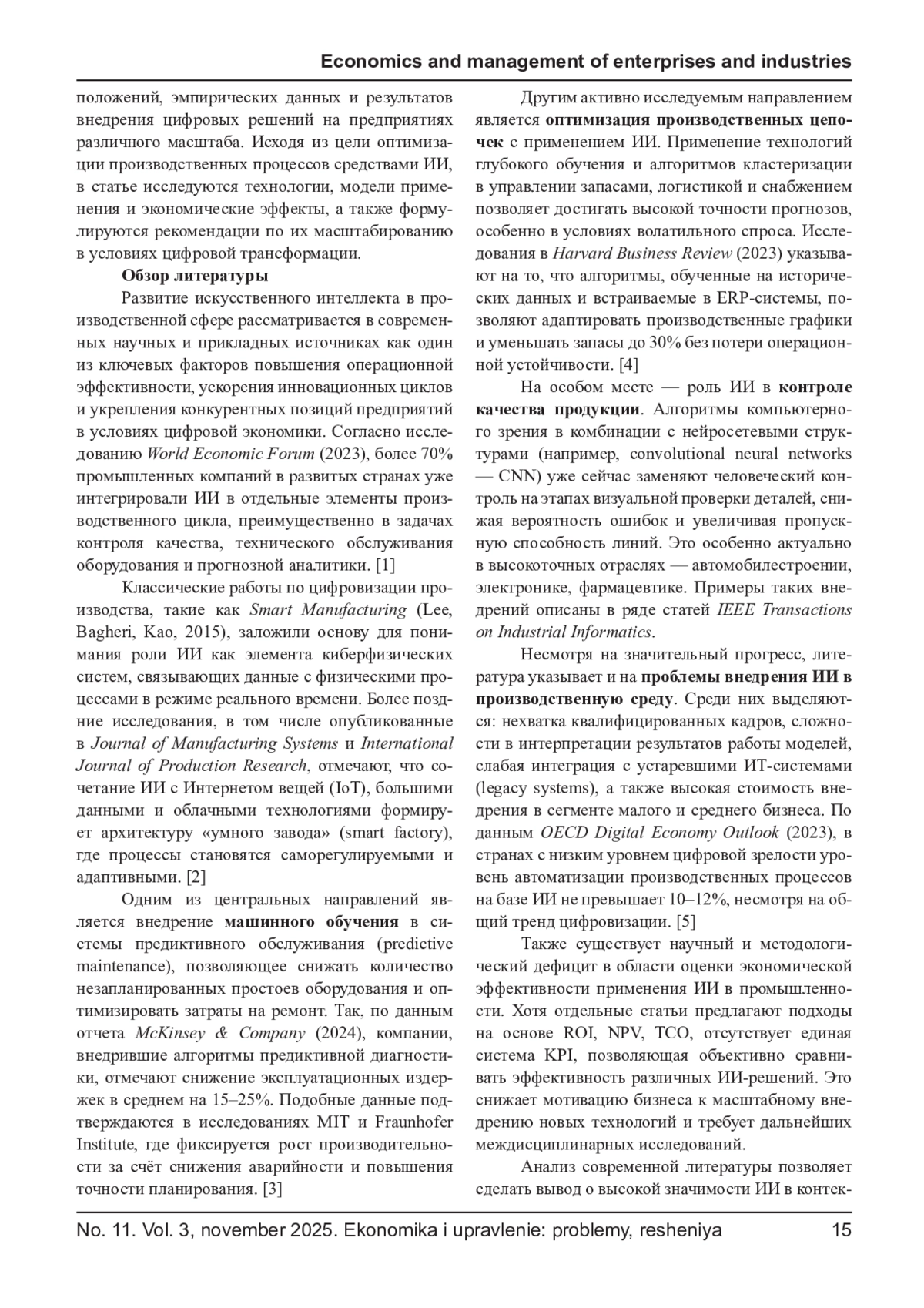 Цель настоящего исследования - выявить направления и оценить эффект внедрения ИИ в систему управления и оптимизации производственных процессов. На основе анализа практик отечественных и зарубежных предприятий выявлены ключевые области применения ИИ: интеллектуальная автоматизация, прогнозное техническое обслуживание, адаптивное планирование и цифровые двойники. Использование смешанного методологического подхода позволило сопоставить количественные показатели экономической эффективности с качественными результатами трансформации организационных и технологических процессов.