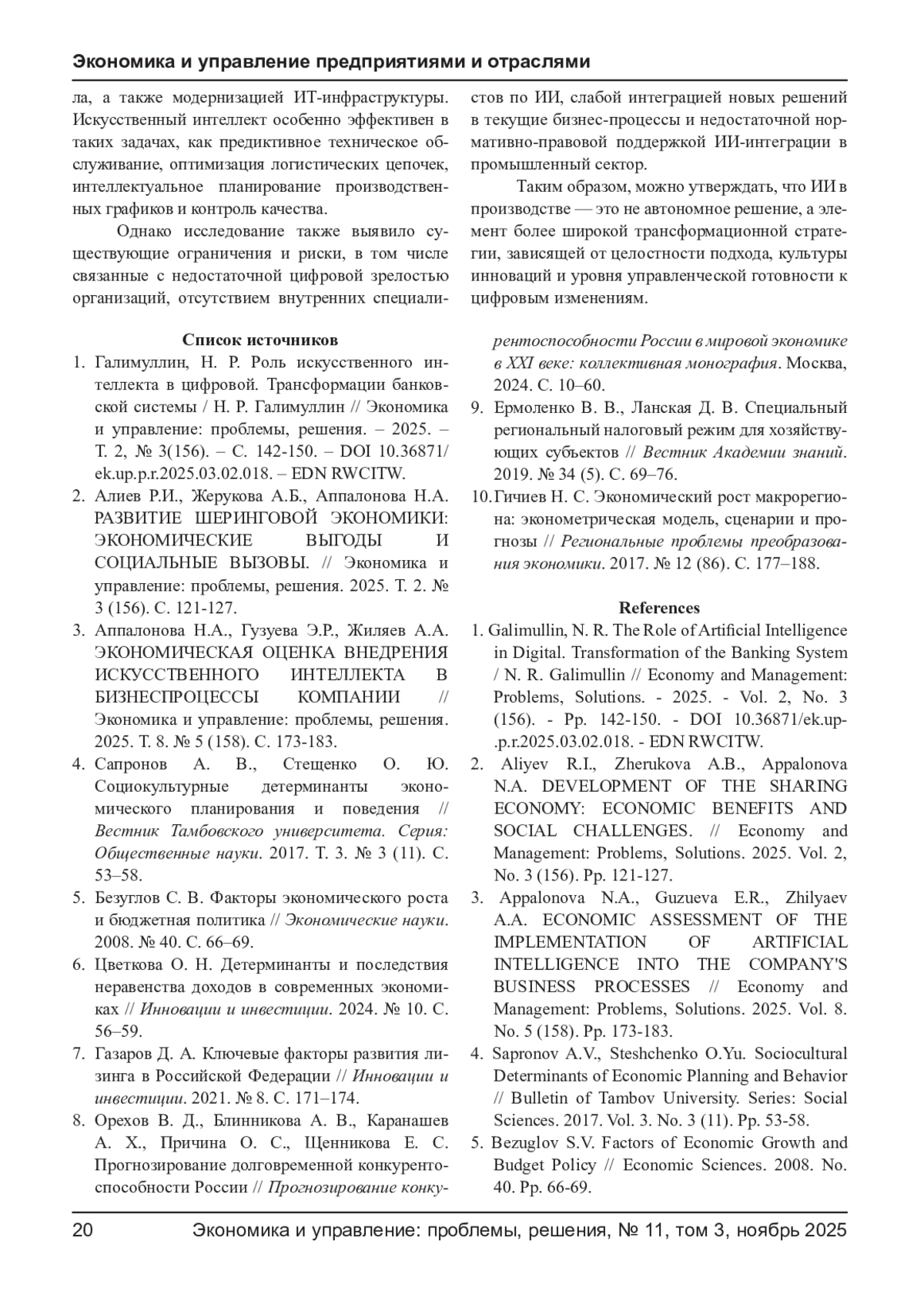 3. Аппалонова Н.А., Гузуева Э.Р., Жиляев А.А. ЭКОНОМИЧЕСКАЯ ОЦЕНКА ВНЕДРЕНИЯ ИСКУССТВЕННОГО ИНТЕЛЛЕКТА В БИЗНЕСПРОЦЕССЫ КОМПАНИИ // Экономика и управление: проблемы, решения. 2025. Т. 8. № 5 (158). С. 173-183. EDN: TFUQIE