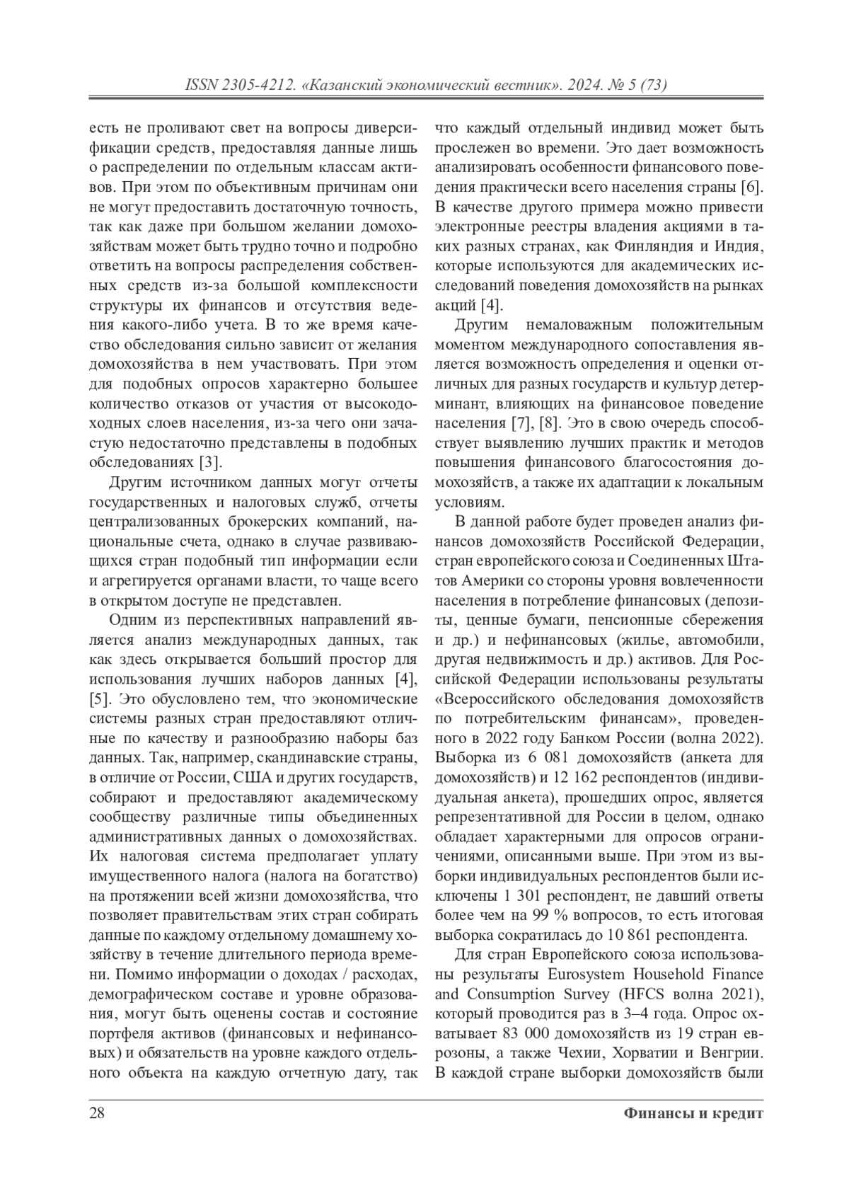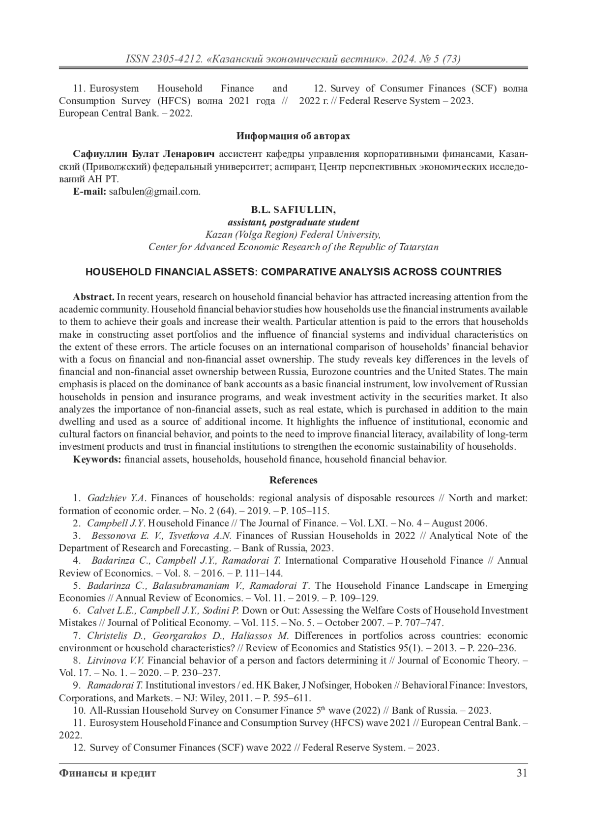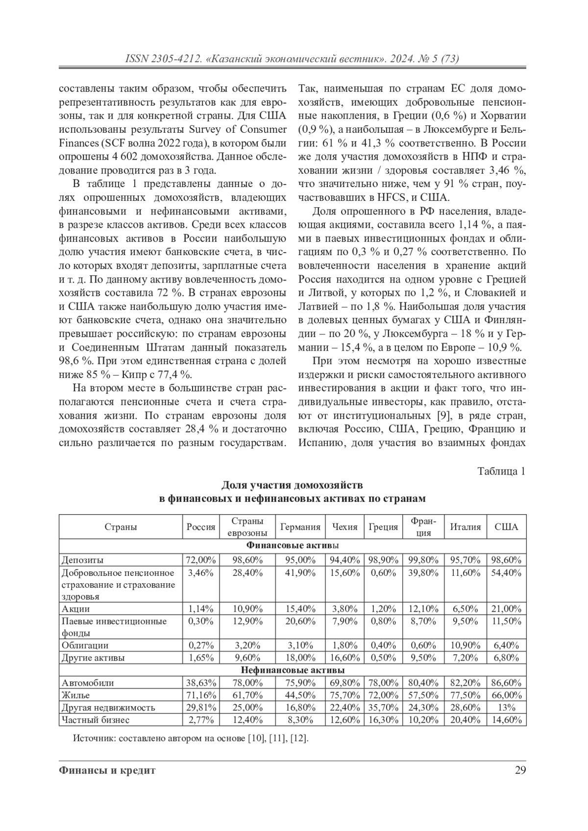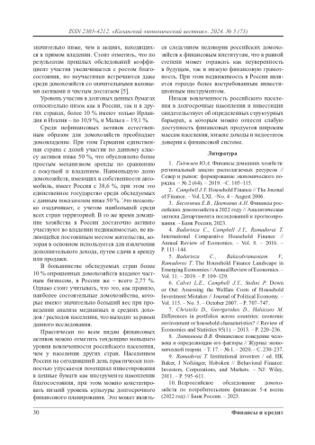 В последние годы исследования в области финансового поведения домохозяйств привлекают все больше внимания научного сообщества. Финансовое поведение домохозяйств изучает, как семьи используют доступные им финансовые инструменты для достижения своих целей и повышения благосостояния. Особое внимание уделяется ошибкам, которые домохозяйства совершают при формировании портфелей активов, а также влиянию финансовых систем и индивидуальных характеристик на степень этих ошибок. Статья посвящена международному сопоставлению финансового поведения домохозяйств с акцентом на владение финансовыми и нефинансовыми активами. Исследование выявляет ключевые различия в уровнях владения финансовыми и нефинансовыми активами между Россией, странами еврозоны и США. Основной акцент сделан на доминировании банковских счетов как базового финансового инструмента, низкой вовлеченности российских домохозяйств в пенсионные и страховые программы, а также на слабой инвестиционной активности на рынке ценных бумаг. Также анализируется значимость нефинансовых активов, таких как недвижимость, которая приобретается дополнительно к основному жилью и используется в качестве источника дополнительного дохода. В статье подчеркивается влияние институциональных, экономических и культурных факторов на финансовое поведение, а также отмечается необходимость повышения финансовой грамотности, доступности долгосрочных инвестиционных продуктов и доверия к финансовым институтам для укрепления экономической устойчивости домохозяйств.