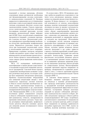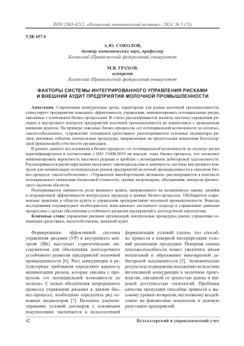 Современная конкурентная среда, характерная для рынка молочной промышленности, стимулирует предприятия повышать эффективность управления, минимизировать потенциальные риски, связанные с ключевыми бизнес-процессами. В статье рассматриваются аспекты системы управления рисками и внутреннего контроля предприятий молочной промышленности во взаимосвязи с проводимым внешним аудитом. На примере сквозных бизнес-процессов «от потенциальной возможности до оплаты», «налогообложение», «управление основными средствами» рассматриваются основные индикаторы рисков, рисковые события, контрольные процедуры, направленные на предпосылки искажения бухгалтерской (финансовой) отчетности организации.