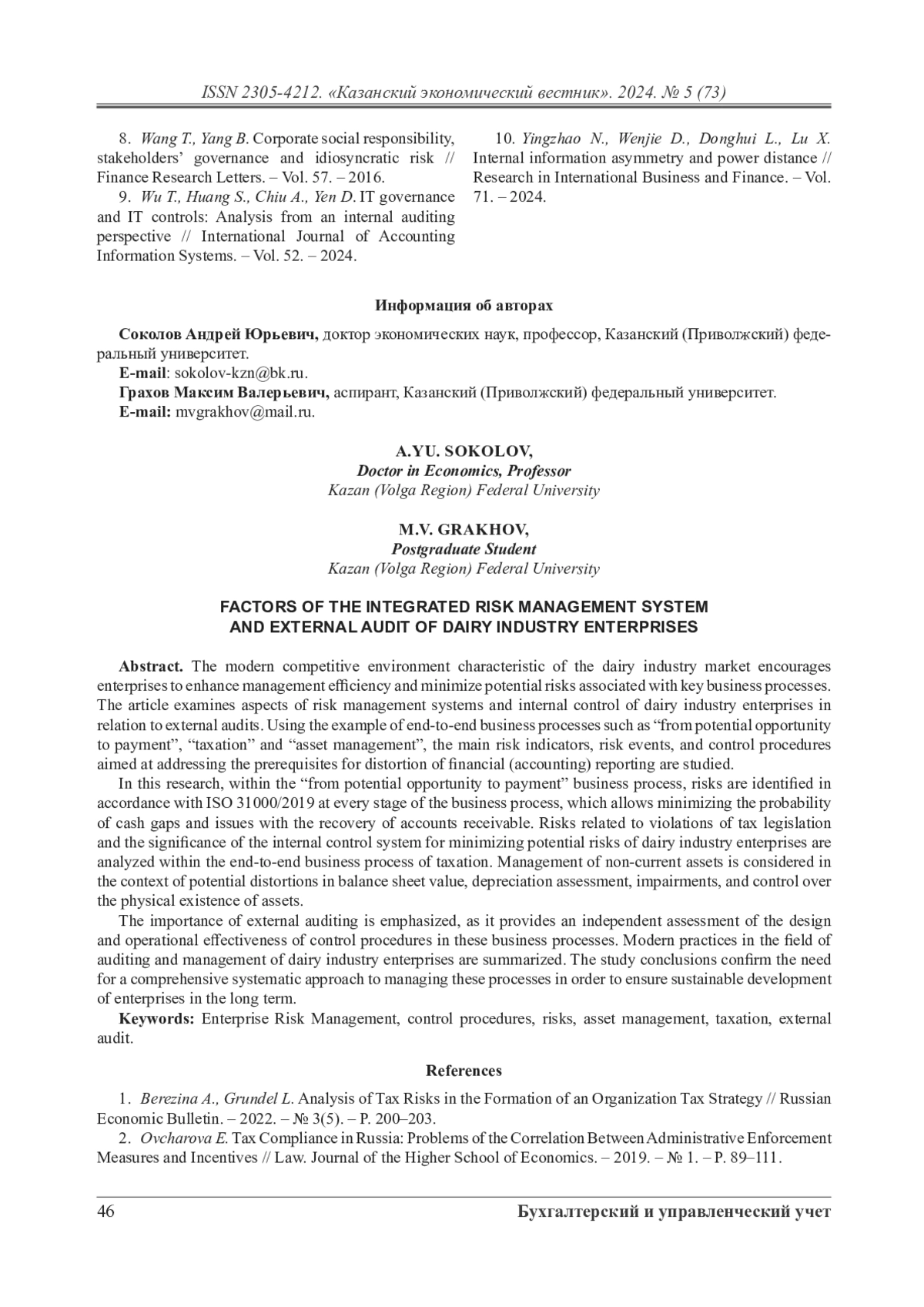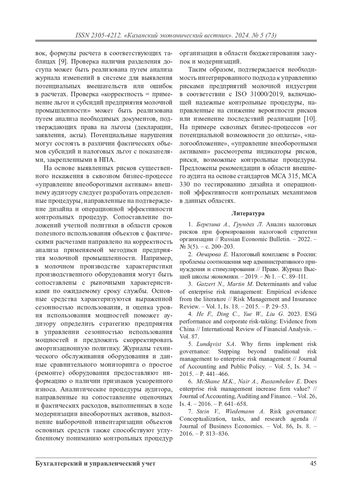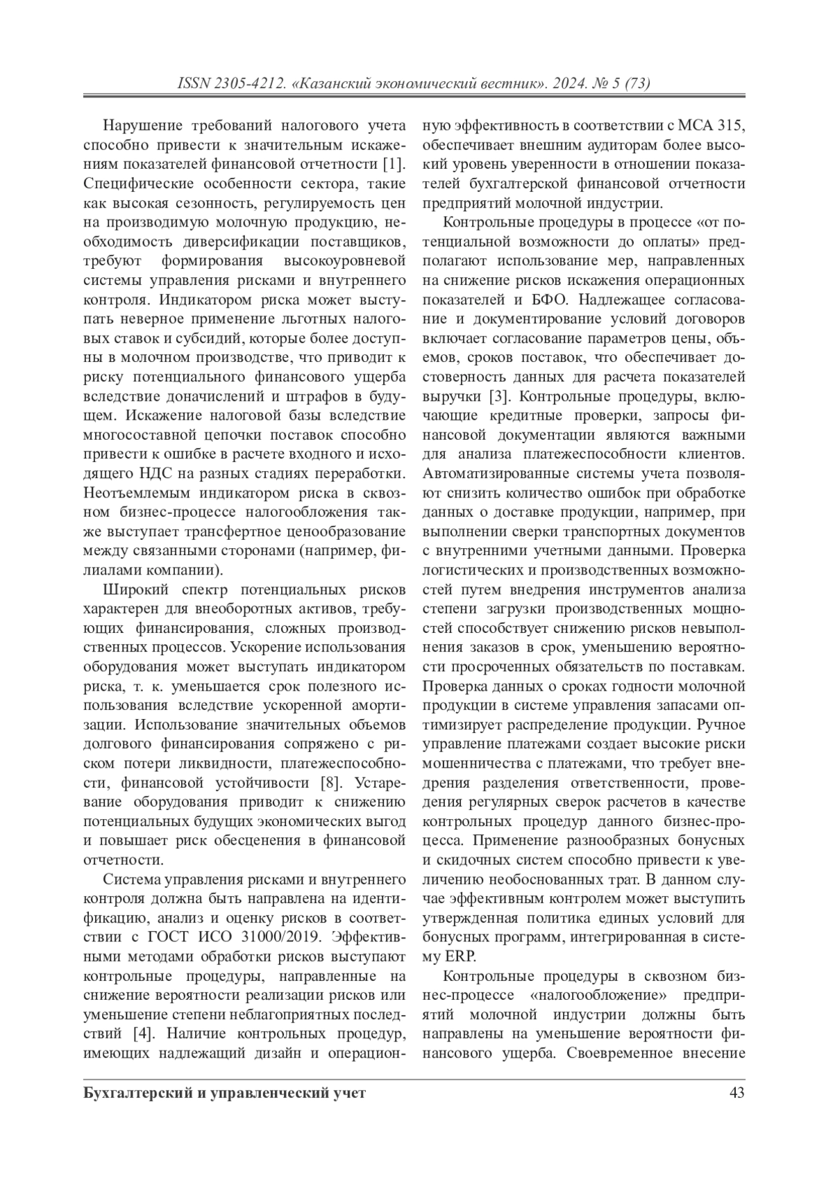 В рамках данного исследования в бизнес-процессе «от потенциальной возможности до оплаты» риски идентифицируются в соответствии с ISO 31000/2019 на каждом этапе бизнес-процесса, что позволяет минимизировать вероятность кассового разрыва и проблем с возмещением дебиторской задолженности. Рассматриваются риски нарушения налогового законодательства и значимость системы внутреннего контроля для минимизации потенциальных рисков предприятий молочной промышленности в сквозном бизнес-процессе «налогообложение». «Управление внеоборотными активами» рассматривается в контексте потенциального искажения балансовой стоимости, оценки амортизации, обесценения, контроля физического наличия объектов.