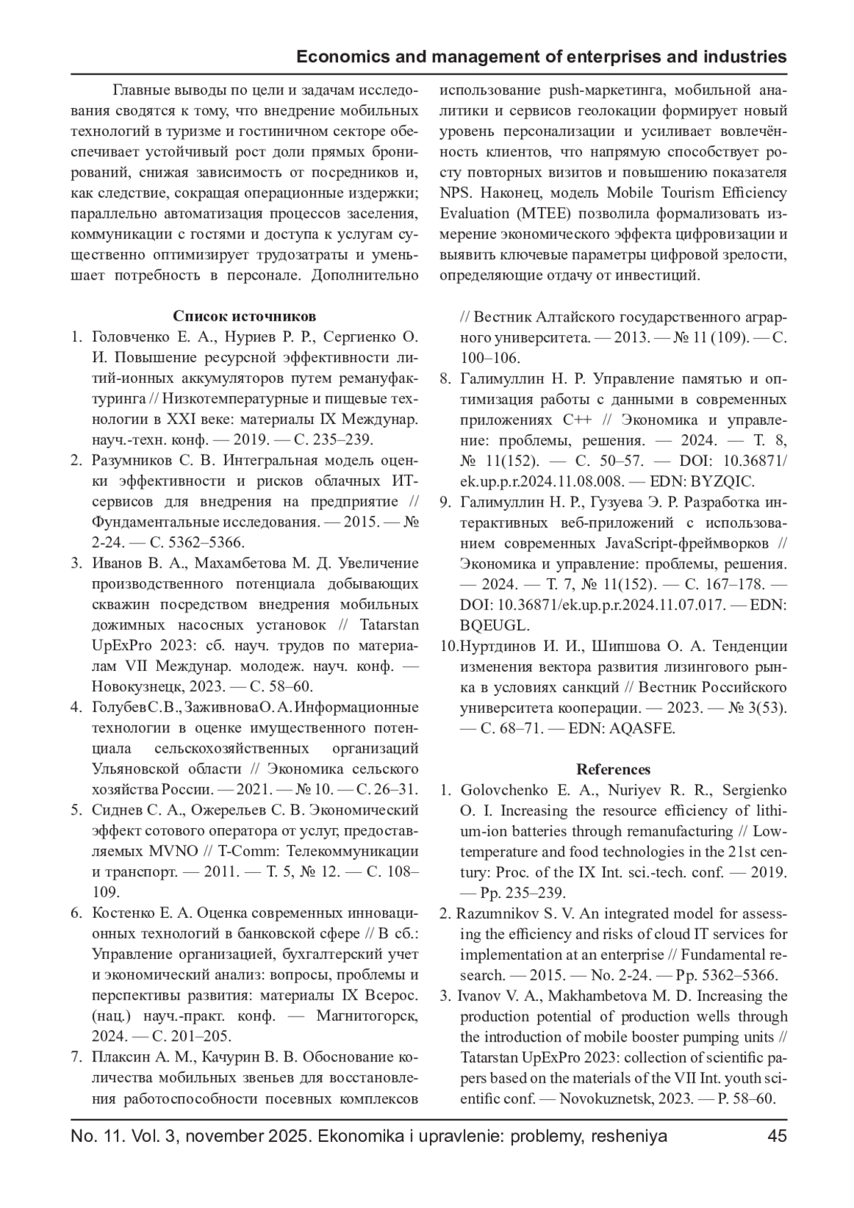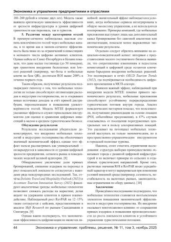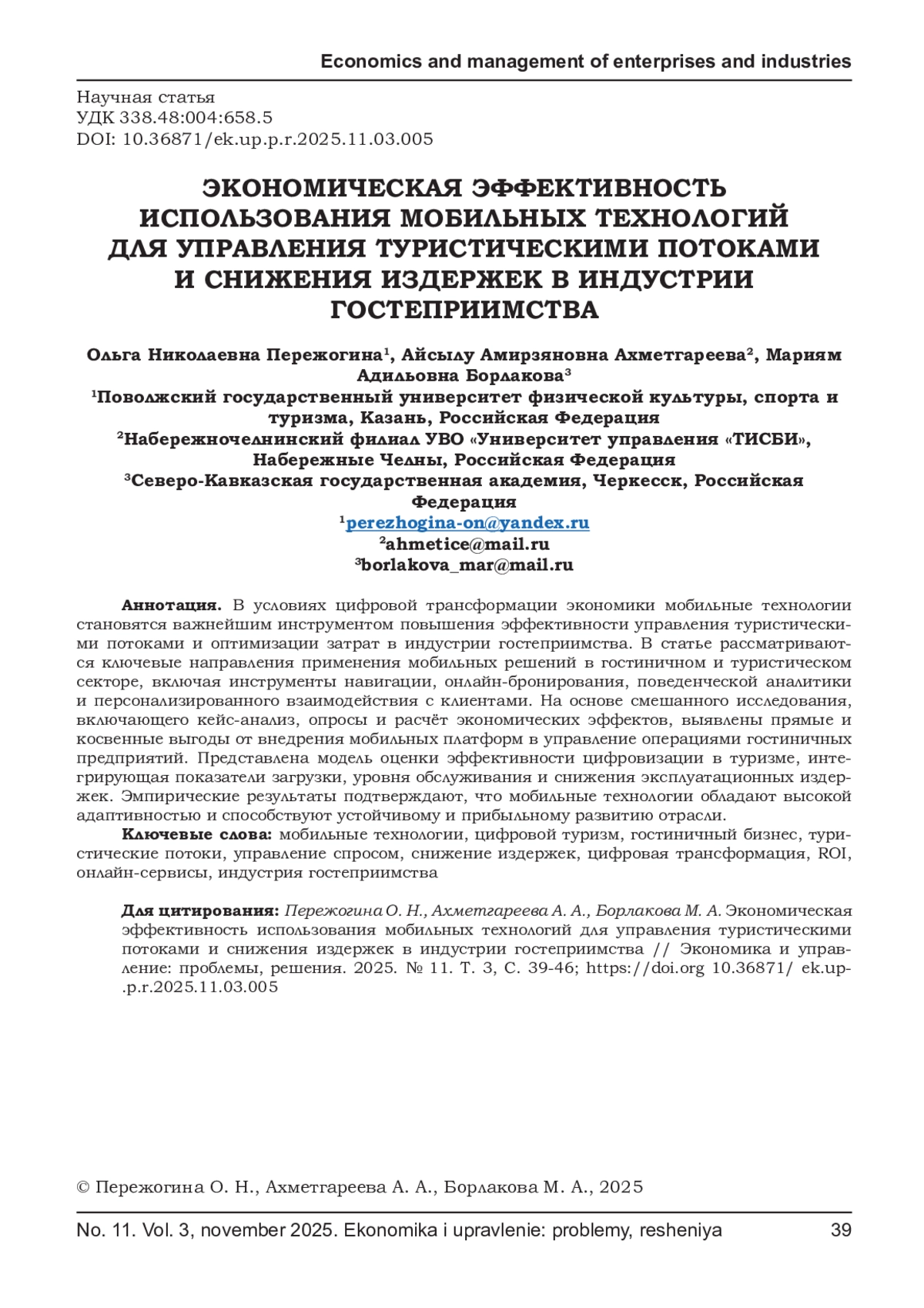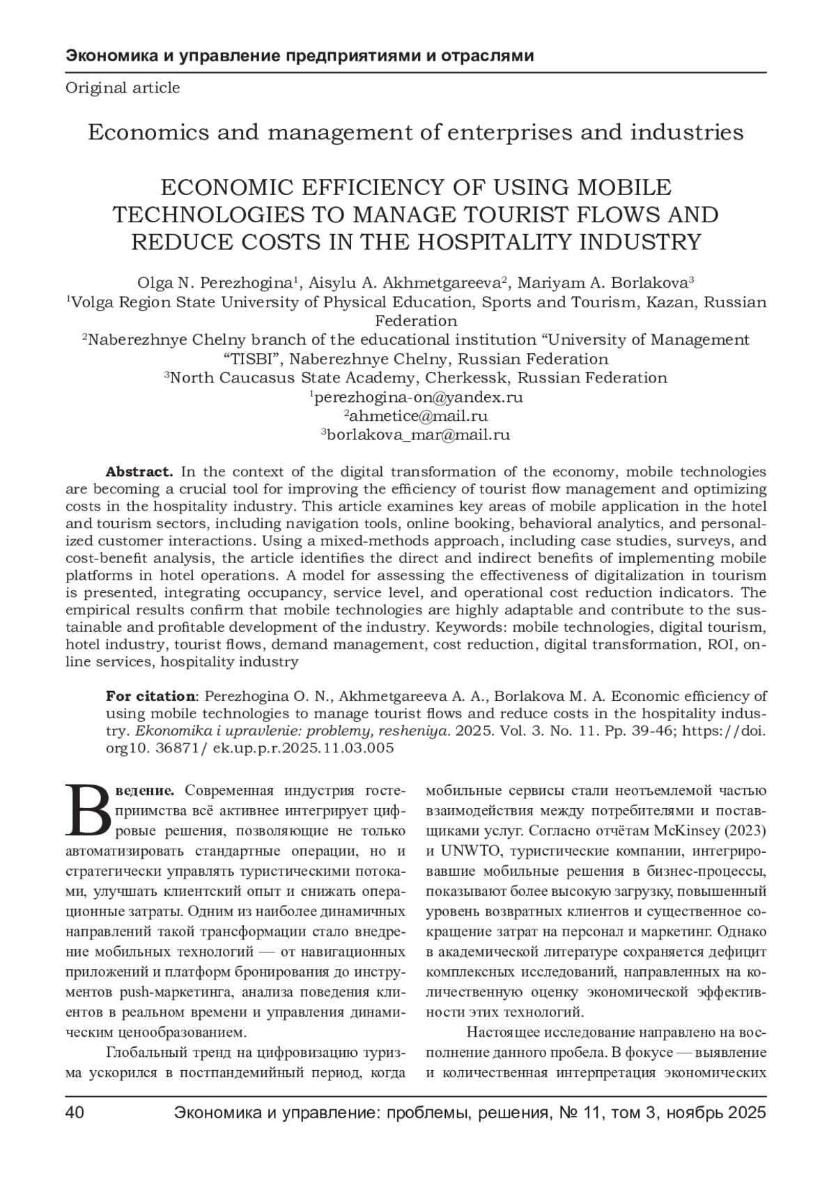 В условиях цифровой трансформации экономики мобильные технологии становятся важнейшим инструментом повышения эффективности управления туристическими потоками и оптимизации затрат в индустрии гостеприимства. В статье рассматриваются ключевые направления применения мобильных решений в гостиничном и туристическом секторе, включая инструменты навигации, онлайн-бронирования, поведенческой аналитики и персонализированного взаимодействия с клиентами. На основе смешанного исследования, включающего кейс-анализ, опросы и расчёт экономических эффектов, выявлены прямые и косвенные выгоды от внедрения мобильных платформ в управление операциями гостиничных предприятий. Представлена модель оценки эффективности цифровизации в туризме, интегрирующая показатели загрузки, уровня обслуживания и снижения эксплуатационных издержек. Эмпирические результаты подтверждают, что мобильные технологии обладают высокой адаптивностью и способствуют устойчивому и прибыльному развитию отрасли.