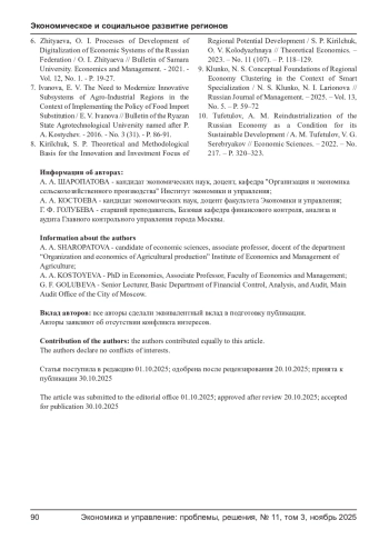 4. Паршуков, Д. В. Статистический анализ структурных сдвигов в доходах сельскохозяйственных организаций под влиянием внешних шоков 2019-2024 годов / Д. В. Паршуков, А. В. Шаропатова, И. А. Абдулрагимов // Международный научно-исследовательский журнал. - 2025. - № 9(159). DOI: 10.60797/IRJ.2025.159.64 EDN: HFCZQR