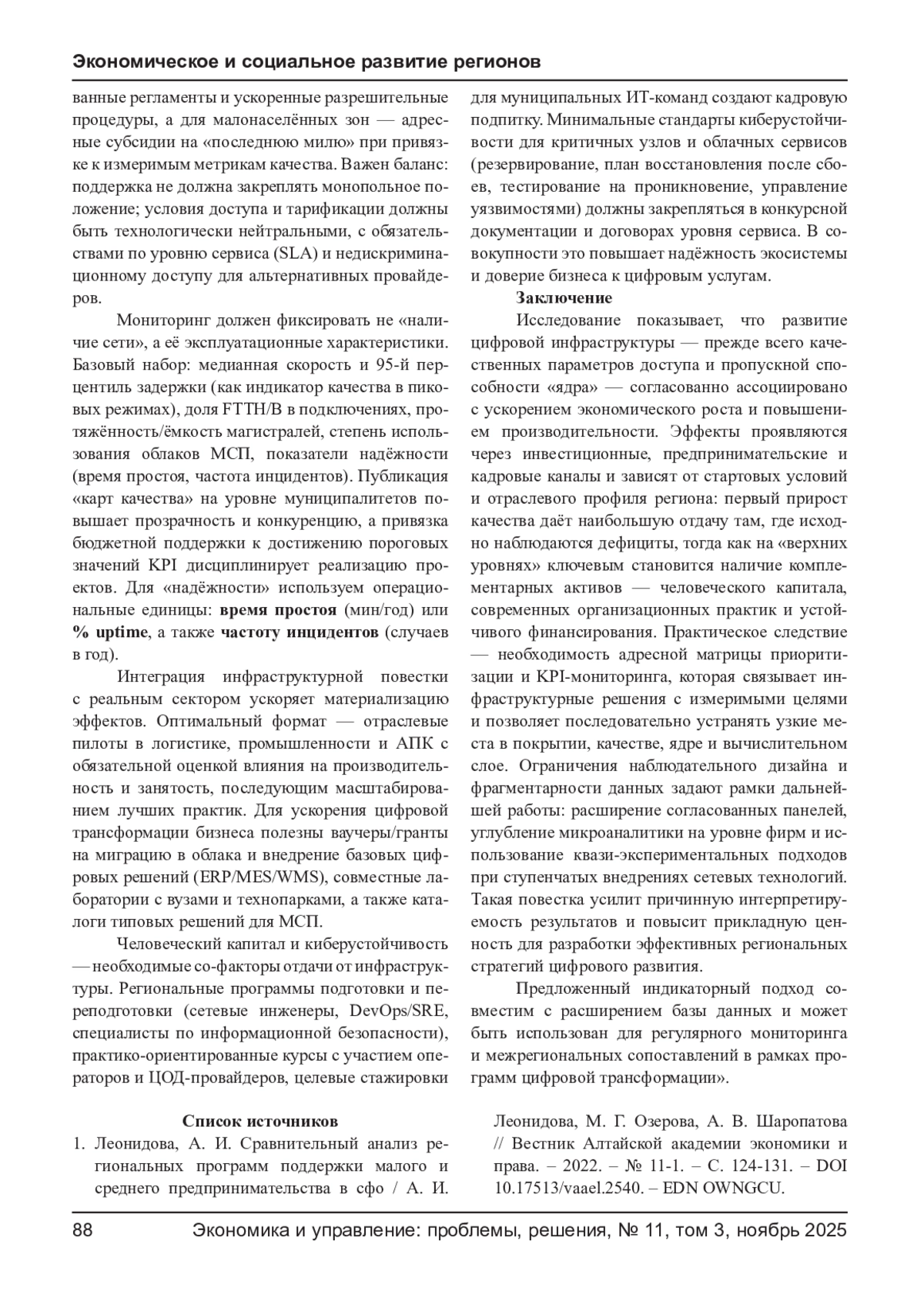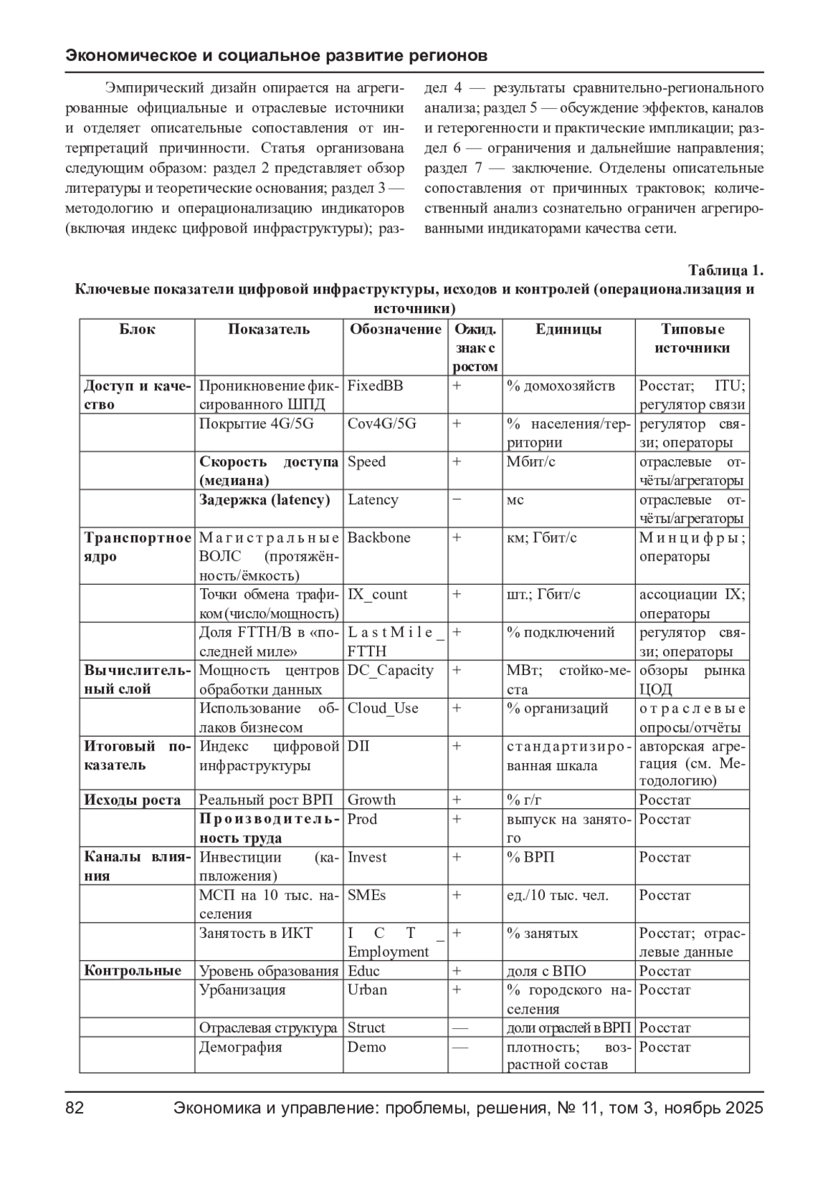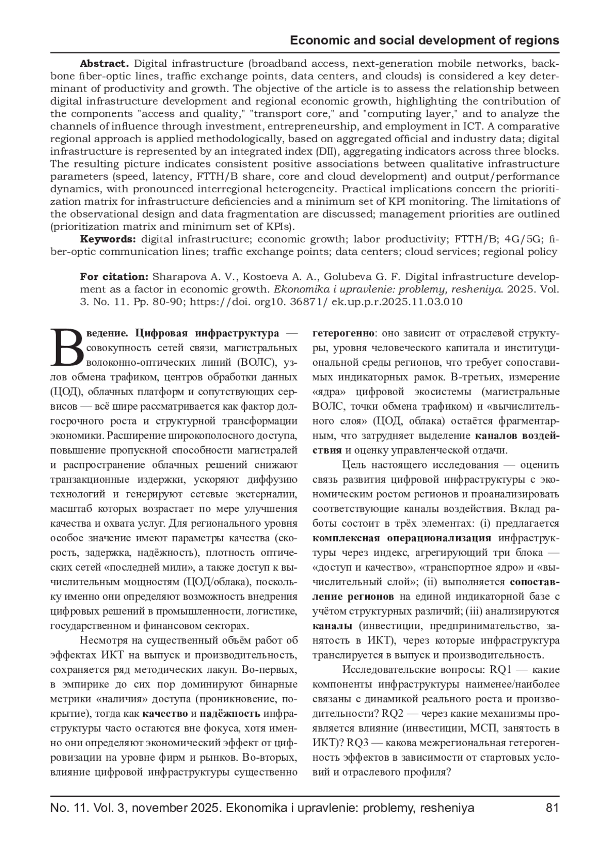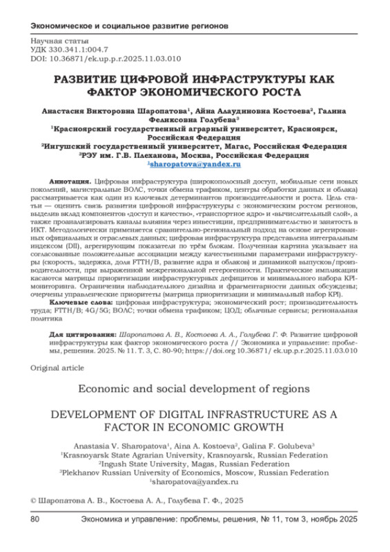 Цель статьи - оценить связь развития цифровой инфраструктуры с экономическим ростом регионов, выделив вклад компонентов «доступ и качество», «транспортное ядро» и «вычислительный слой», а также проанализировать каналы влияния через инвестиции, предпринимательство и занятость в ИКТ. Методологически применяется сравнительно-региональный подход на основе агрегированных официальных и отраслевых данных; цифровая инфраструктура представлена интегральным индексом (DII), агрегирующим показатели по трём блокам. Полученная картина указывает на согласованные положительные ассоциации между качественными параметрами инфраструктуры (скорость, задержка, доля FTTH/B, развитие ядра и облаков) и динамикой выпусков/производительности, при выраженной межрегиональной гетерогенности. Практические импликации касаются матрицы приоритизации инфраструктурных дефицитов и минимального набора KPIмониторинга. Ограничения наблюдательного дизайна и фрагментарности данных обсуждены; очерчены управленческие приоритеты (матрица приоритизации и минимальный набор KPI).