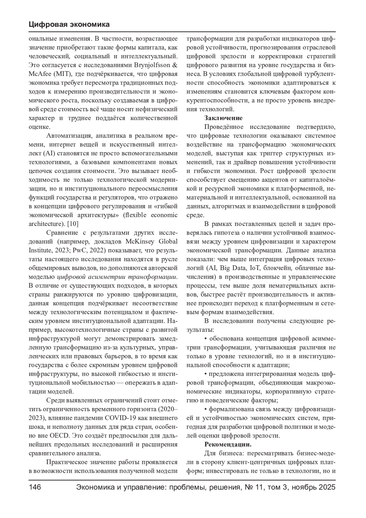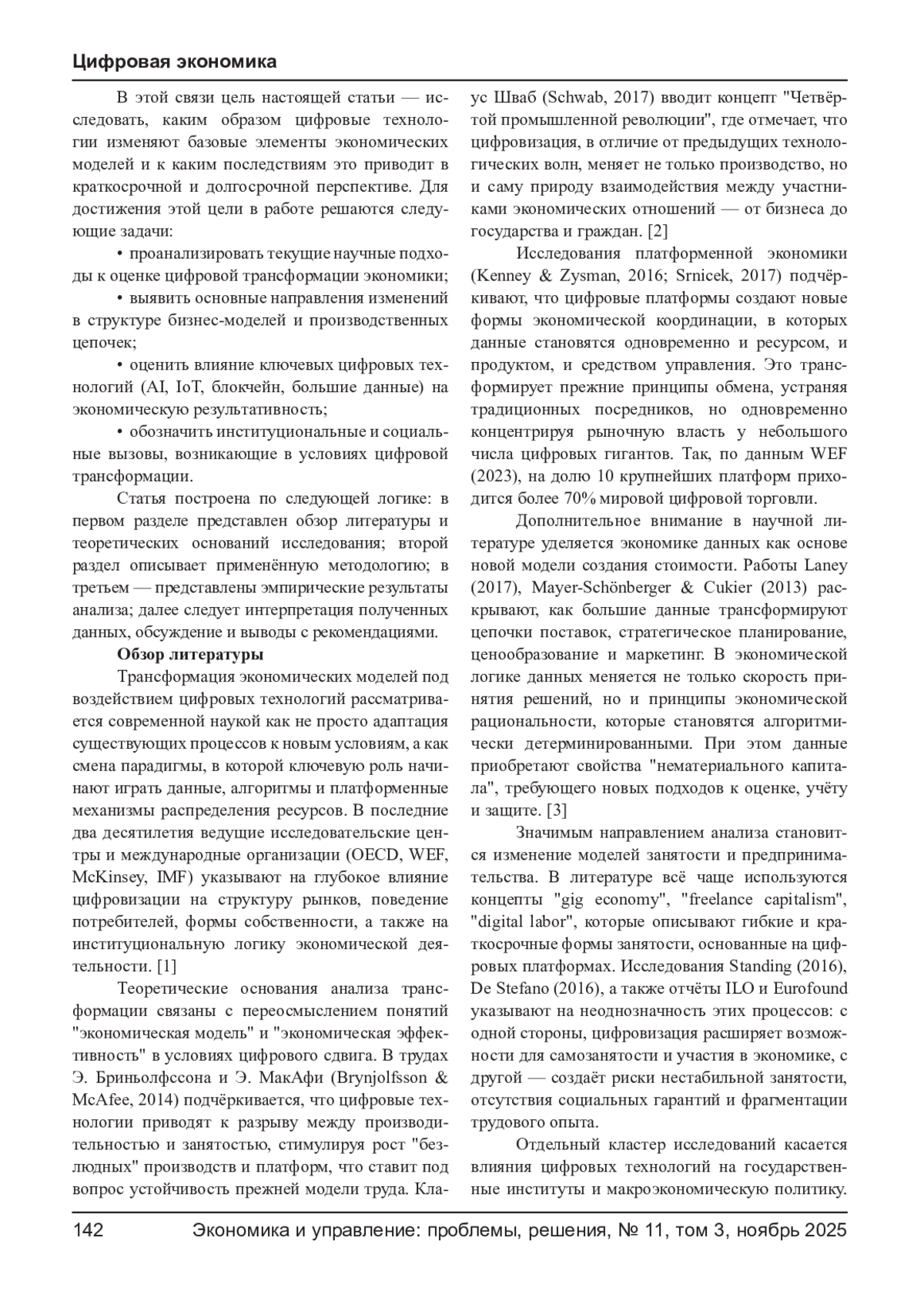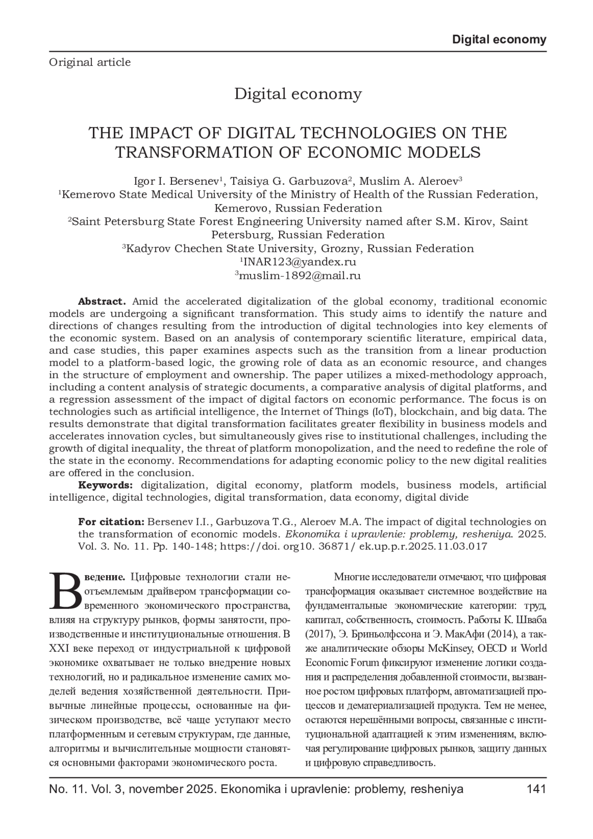 Цифровые технологии стали неотъемлемым драйвером трансформации современного экономического пространства, влияя на структуру рынков, формы занятости, производственные и институциональные отношения.