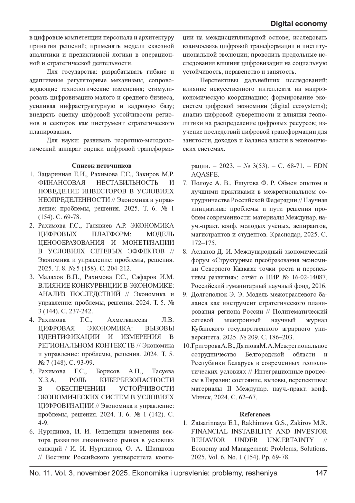 4. Рахимова Г.С., Ахметвалеева Л.В. ЦИФРОВАЯ ЭКОНОМИКА: ВЫЗОВЫ ИДЕНТИФИКАЦИИ И ИЗМЕРЕНИЯ В РЕГИОНАЛЬНОМ КОНТЕКСТЕ // Экономика и управление: проблемы, решения. 2024. Т. 5. № 7 (148). С. 93-99. EDN: CAONCB