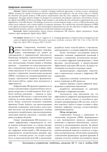 Цель настоящего исследования - выявить направления и особенности трансформации HR-практик в условиях активного внедрения цифровых технологий в управление. В работе проанализированы изменения в стратегиях подбора, развития, мотивации и удержания персонала, рассмотрены ключевые цифровые инструменты (HRIS, AI-рекрутинг, People Analytics), а также обозначены риски и барьеры, с которыми сталкиваются организации в процессе цифровизации HR-функции.