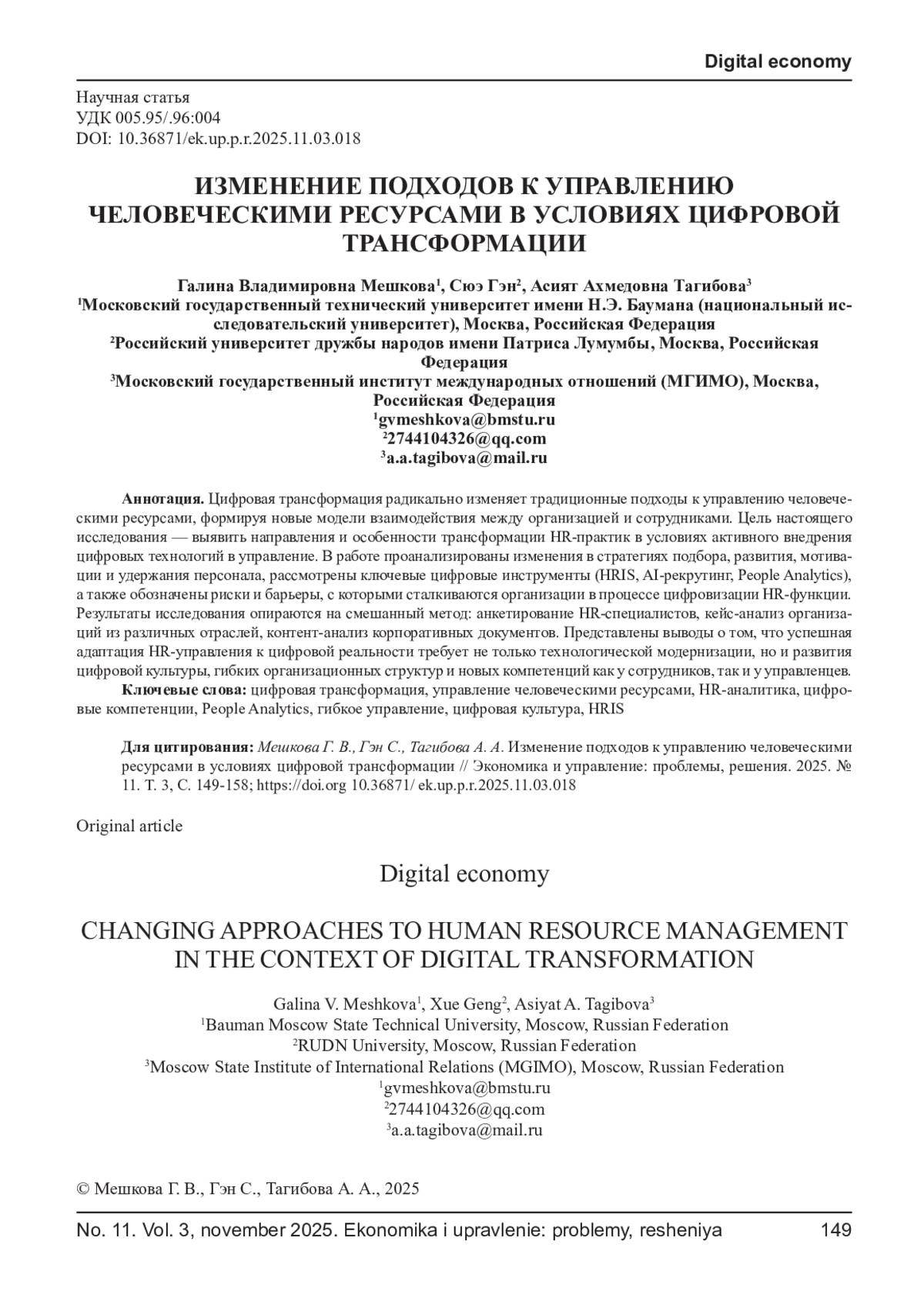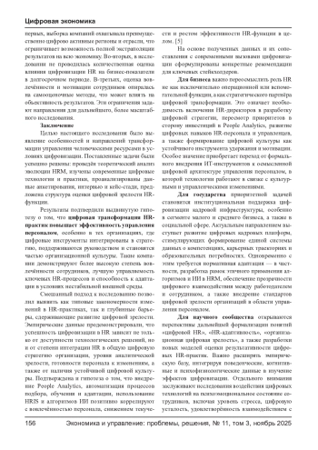 Результаты исследования опираются на смешанный метод: анкетирование HR-специалистов, кейс-анализ организаций из различных отраслей, контент-анализ корпоративных документов. Представлены выводы о том, что успешная адаптация HR-управления к цифровой реальности требует не только технологической модернизации, но и развития цифровой культуры, гибких организационных структур и новых компетенций как у сотрудников, так и у управленцев.