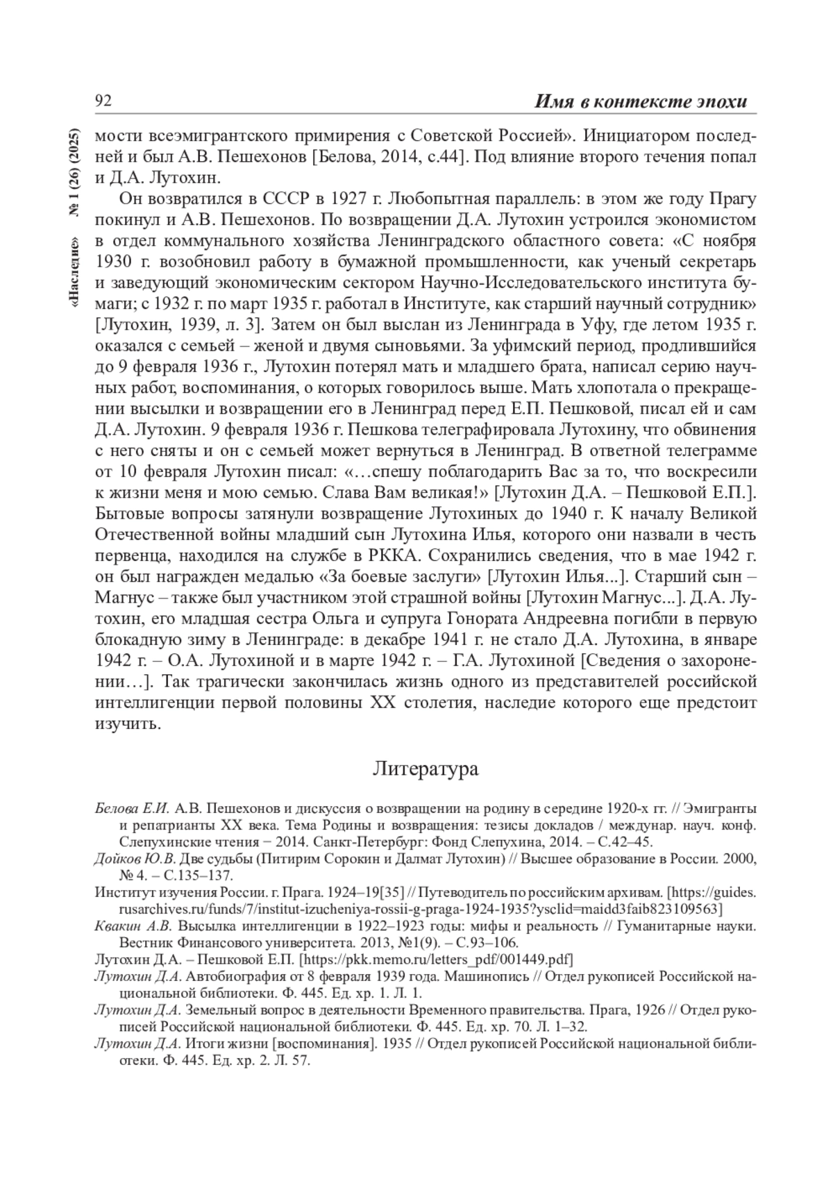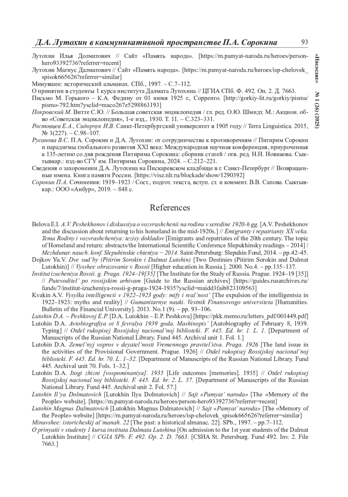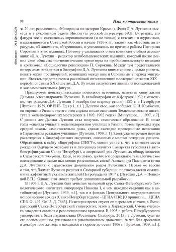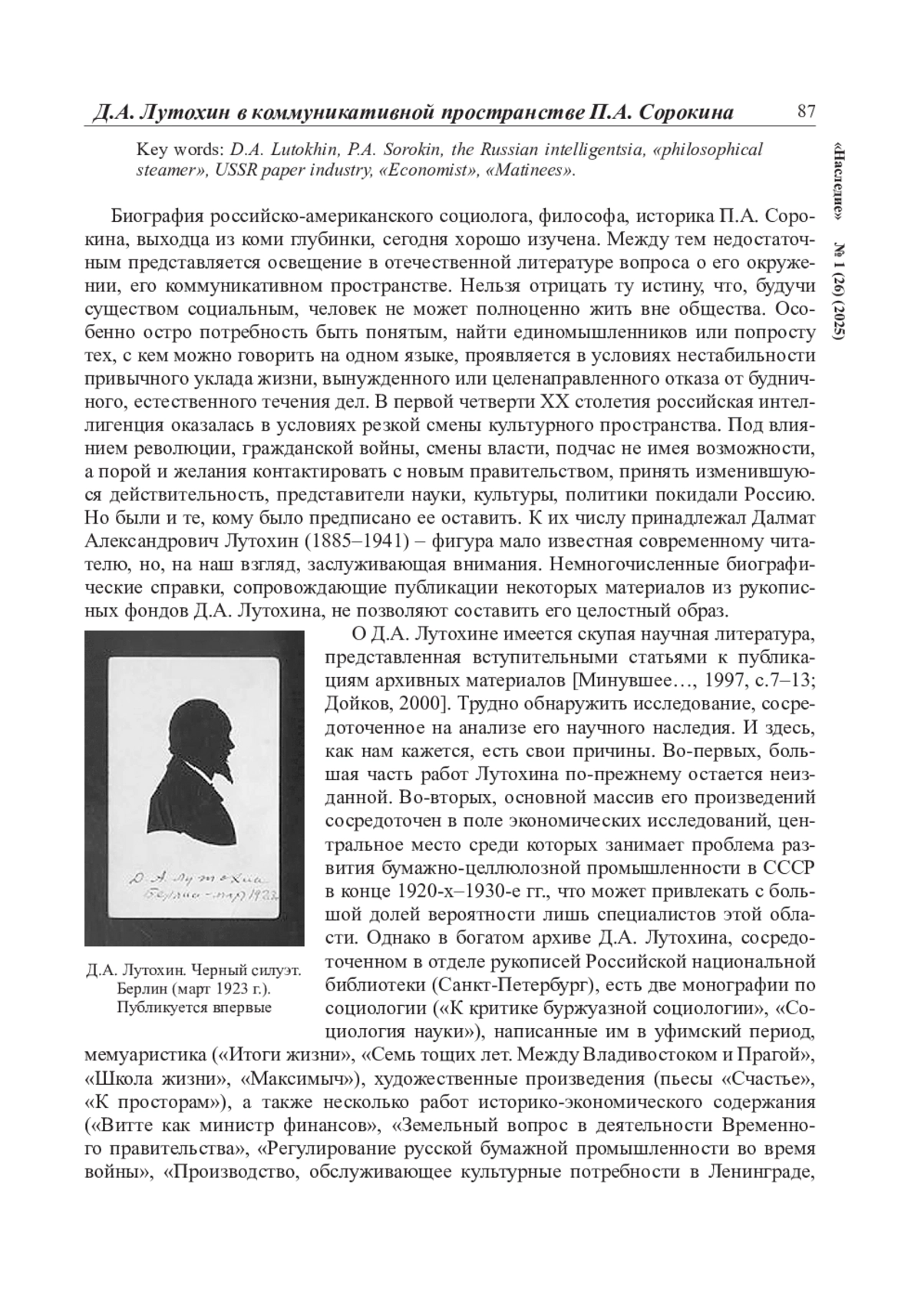 Биография российско-американского социолога, философа, историка П. А. Сорокина, выходца из коми глубинки, сегодня хорошо изучена. Между тем недостаточным представляется освещение в отечественной литературе вопроса о его окружении, его коммуникативном пространстве. Нельзя отрицать ту истину, что, будучи существом социальным, человек не может полноценно жить вне общества. Особенно остро потребность быть понятым, найти единомышленников или попросту тех, с кем можно говорить на одном языке, проявляется в условиях нестабильности привычного уклада жизни, вынужденного или целенаправленного отказа от будничного, естественного течения дел. В первой четверти XX столетия российская интеллигенция оказалась в условиях резкой смены культурного пространства. Под влиянием революции, гражданской войны, смены власти, подчас не имея возможности, а порой и желания контактировать с новым правительством, принять изменившуюся действительность, представители науки, культуры, политики покидали Россию. Но были и те, кому было предписано ее оставить. К их числу принадлежал Далмат Александрович Лутохин (1885–1941) – фигура мало известная современному читателю, но, на наш взгляд, заслуживающая внимания. Немногочисленные биографические справки, сопровождающие публикации некоторых материалов из рукописных фондов Д. А. Лутохина, не позволяют составить его целостный образ.