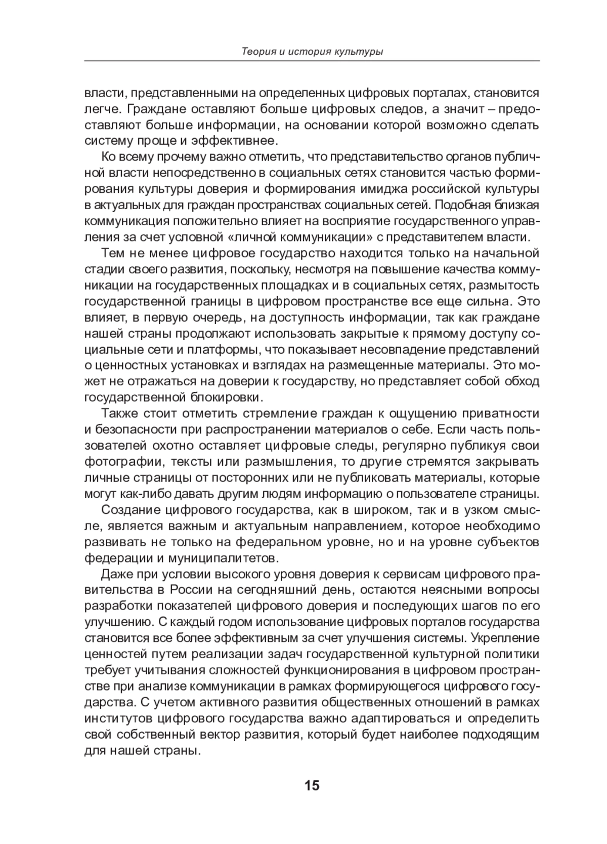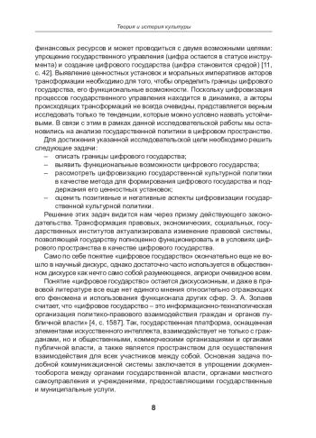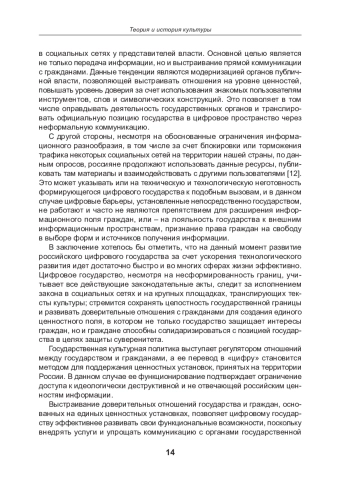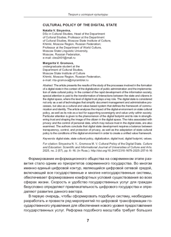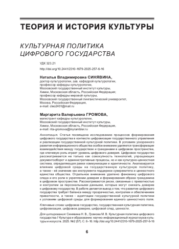 Статья посвящена исследованию процессов формирования цифрового государства в контексте цифровизации государственного управления и реализации государственной культурной политики. В условиях ускоренного развития информационного общества особое внимание уделяется трансформации взаимодействия между государством и гражданами в цифровом пространстве, где ключевую роль играет уровень цифрового доверия. Цифровое государство рассматривается не только как совокупность технологий, упрощающих документооборот и административные процессы, но и как культурно ценностная система, определяющая рамки коммуникации и идентичности. Анализируется влияние цифровой среды на государственную культурную политику, а также её значение как инструмента поддержки суверенитета и ценностного единства общества. Отдельное внимание уделено феномену цифрового следа и его роли в укреплении доверия и формирования образа гражданина в цифровом пространстве. Рассматриваются риски, связанные с приватностью и контролем за персональными данными, которые могут снижать доверие к цифровому государству. В работе делается вывод о том, что развитие цифрового государства требует баланса между прозрачностью, контролем и обеспечением приватности, а также адаптации государственной культурной политики к условиям цифровой среды для формирования единого ценностного поля.