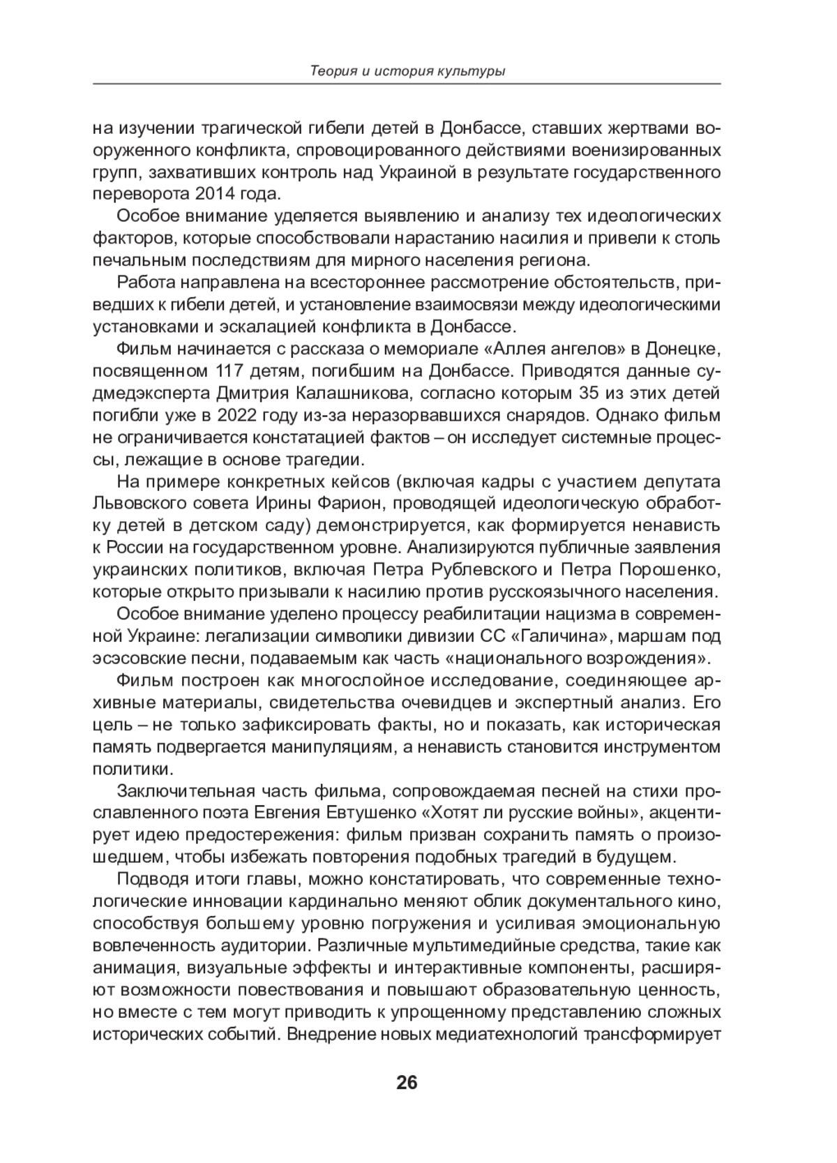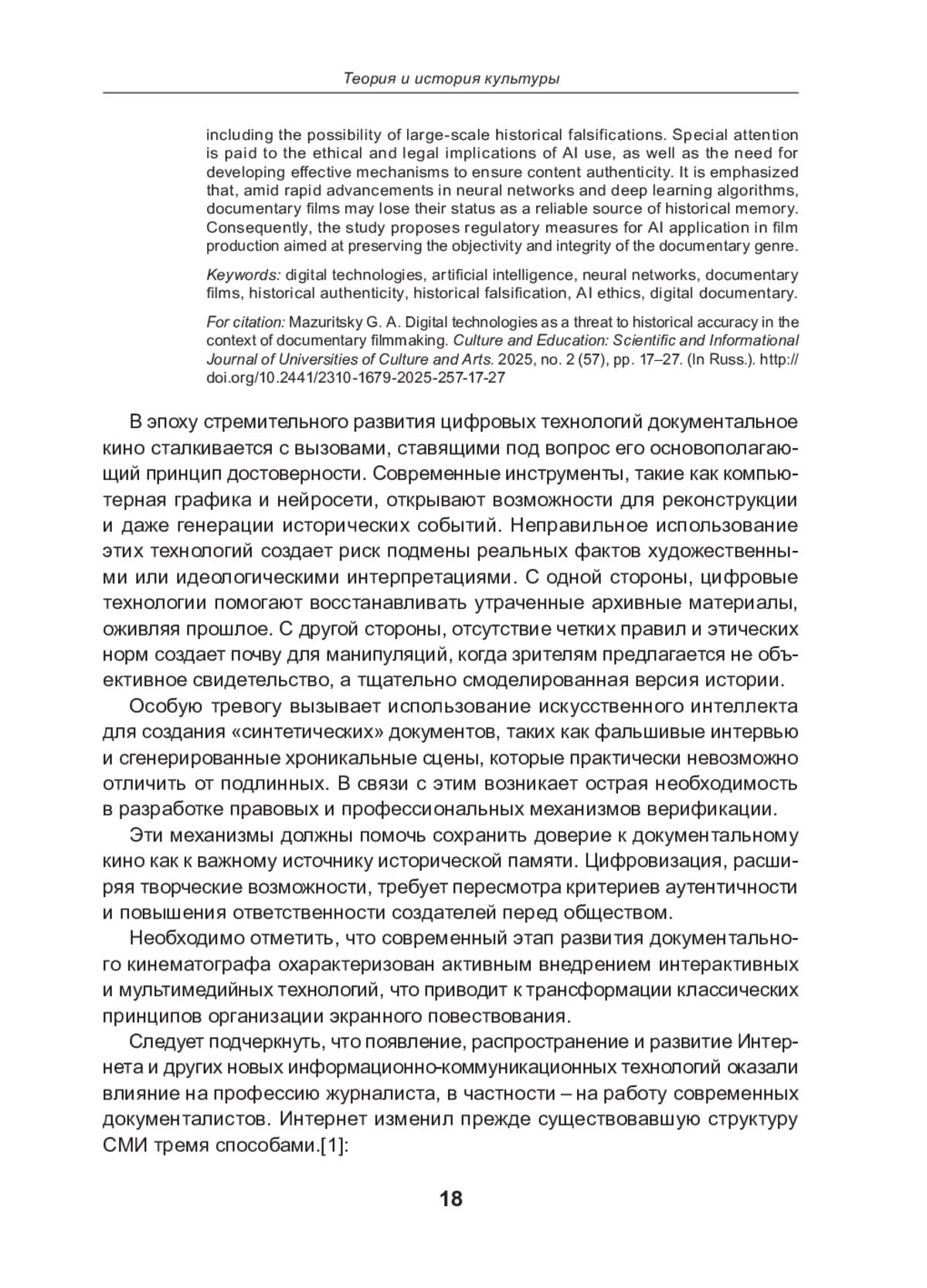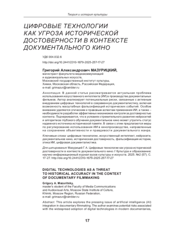 В данной статье рассматривается актуальная проблема использования искусственного интеллекта (ИИ) в производстве документальных фильмов. Автор анализирует потенциальные риски, связанные с активным внедрением цифровых технологий в современную документалистику, включая возможность масштабных фальсификаций исторических событий. Особое внимание уделяется этическим и правовым аспектам применения ИИ, а также необходимости разработки эффективных механизмов контроля за достоверностью контента. Подчеркивается, что в условиях стремительного развития нейросетей и алгоритмов глубокого обучения документальное кино может утратить статус надежного источника исторической памяти. В связи с этим предлагаются меры по регулированию использования ИИ в кинопроизводстве, направленные на сохранение объективности и правдивости документального жанра.