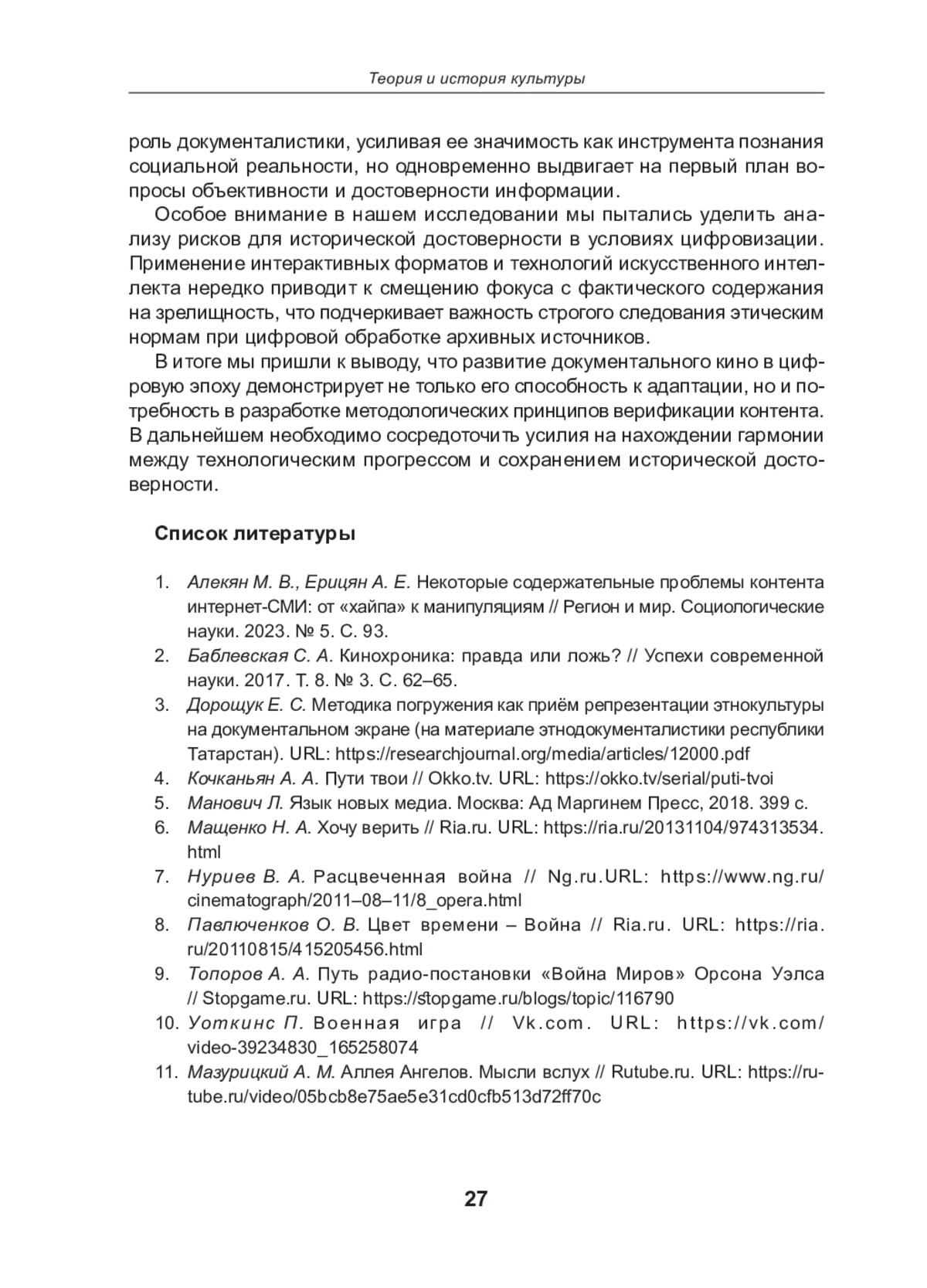 2. Баблевская С. А. Кинохроника: правда или ложь? // Успехи современной науки. 2017. Т. 8. № 3. С. 62-65. EDN: YNFPYX
