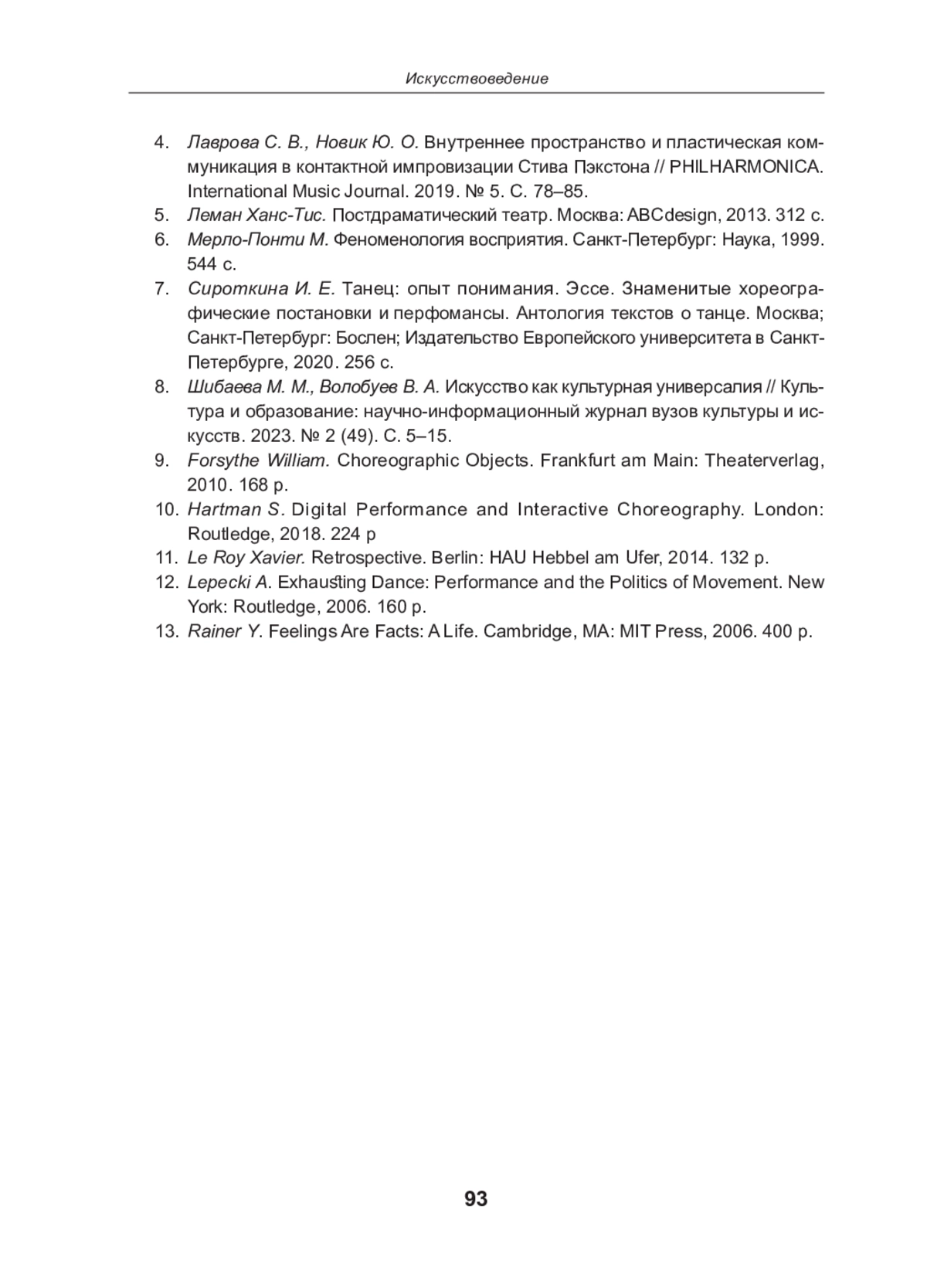 7. Сироткина И. Е. Танец: опыт понимания. Эссе. Знаменитые хореографические постановки и перфомансы. Антология текстов о танце. Москва; Санкт-Петербург: Бослен; Издательство Европейского университета в Санкт-Петербурге, 2020. 256 с.