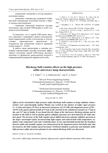 I. V. Irkhin, А. А. Sukhachevsky, and О. А. Popov Discharge bulb rotation effects on the high pressure sulfur micro-wave lamp characteristics 454