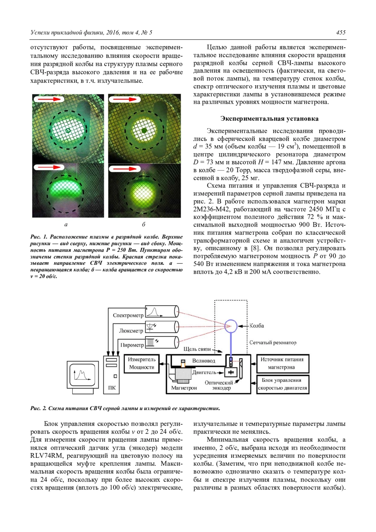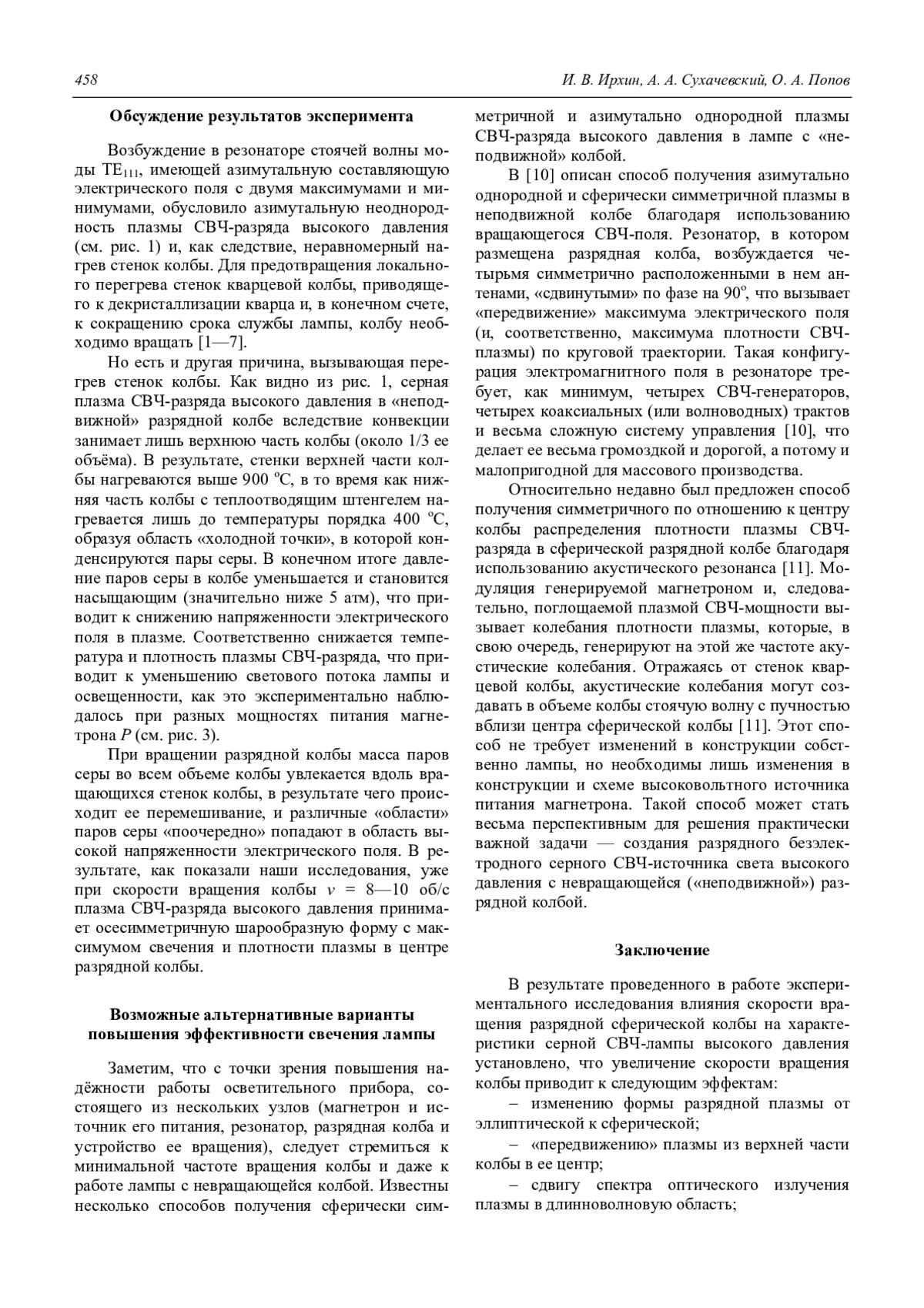 Ирхин И. В., Сухачевский А. А., Попов О. А. Экспериментальное исследование влияния вращения разрядной колбы на характеристики серной СВЧ-лампы высокого давления 454