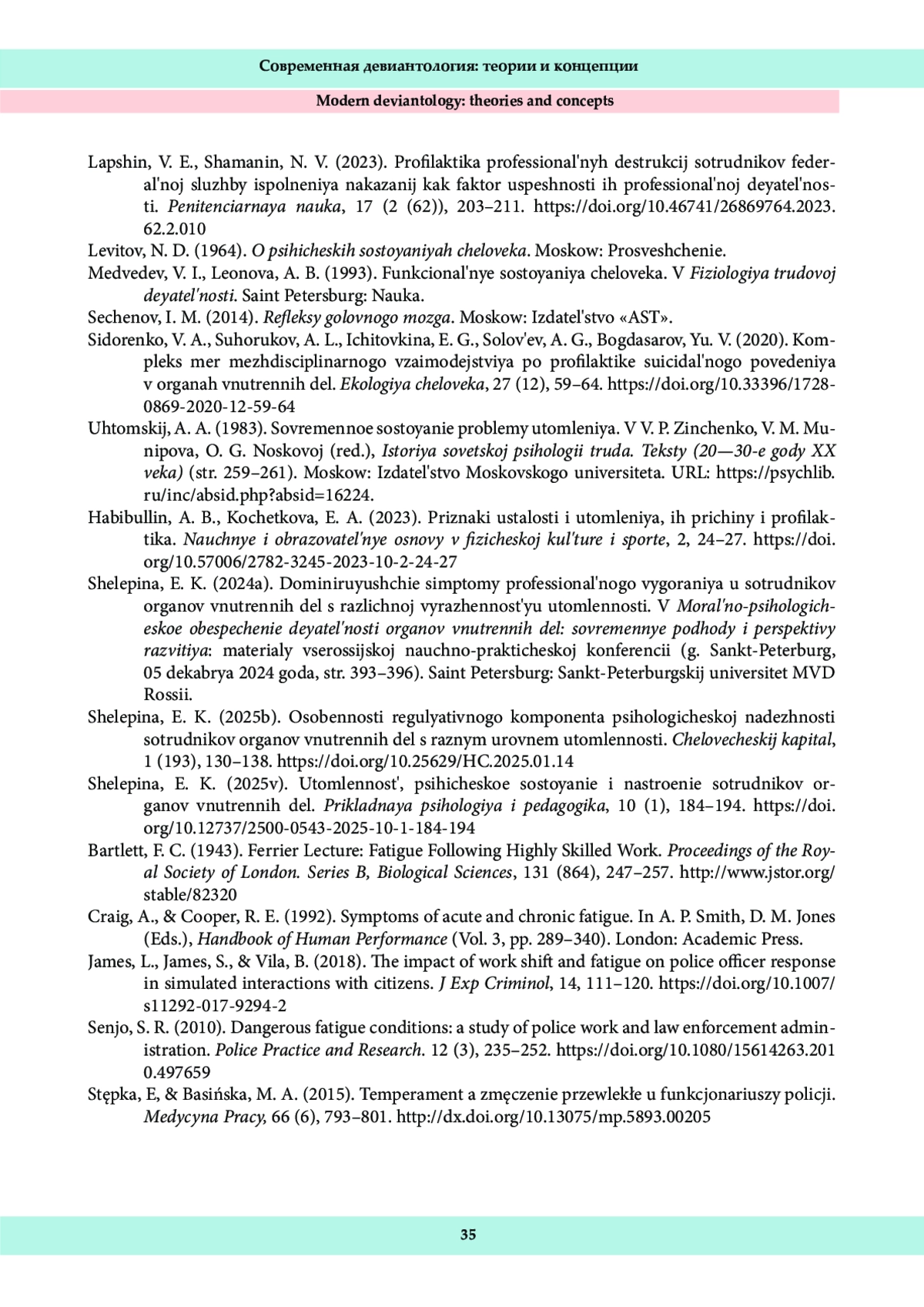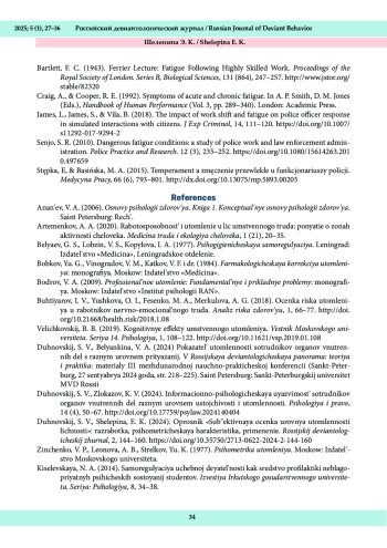 21. Шелепина, Э. К. (2025б). Особенности регулятивного компонента психологической надежности сотрудников органов внутренних дел с разным уровнем утомленности. Человеческий капитал, 1 (193), 130-138. DOI: 10.25629/HC.2025.01.14 EDN: KMFBSY