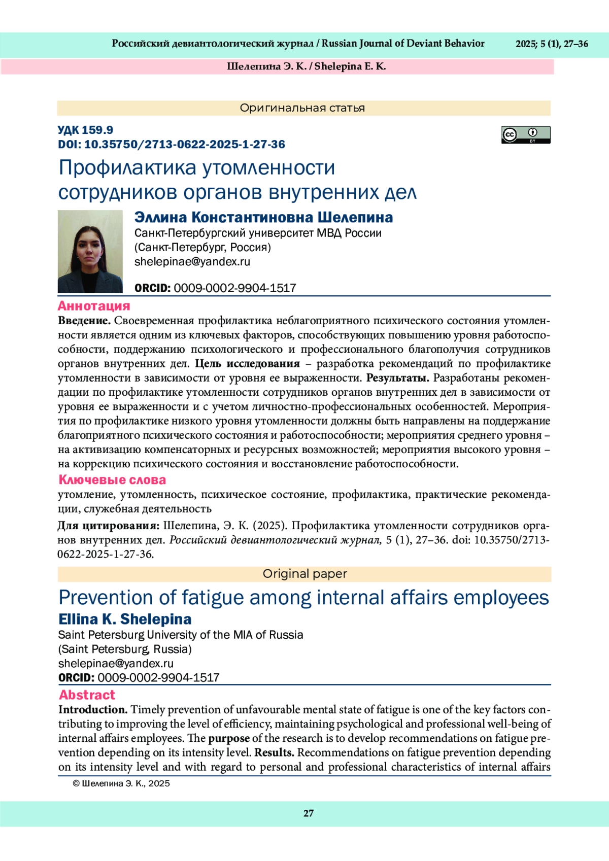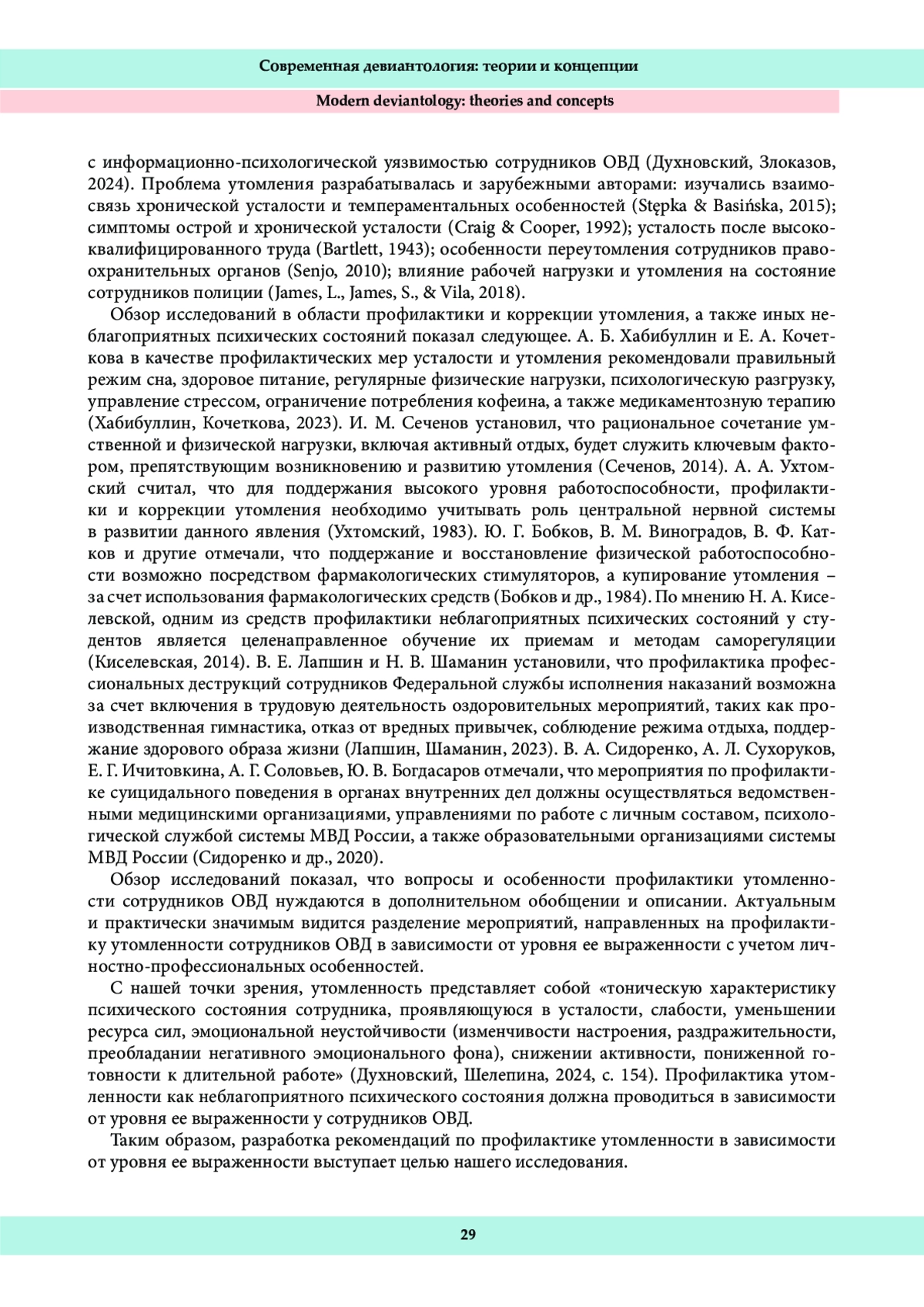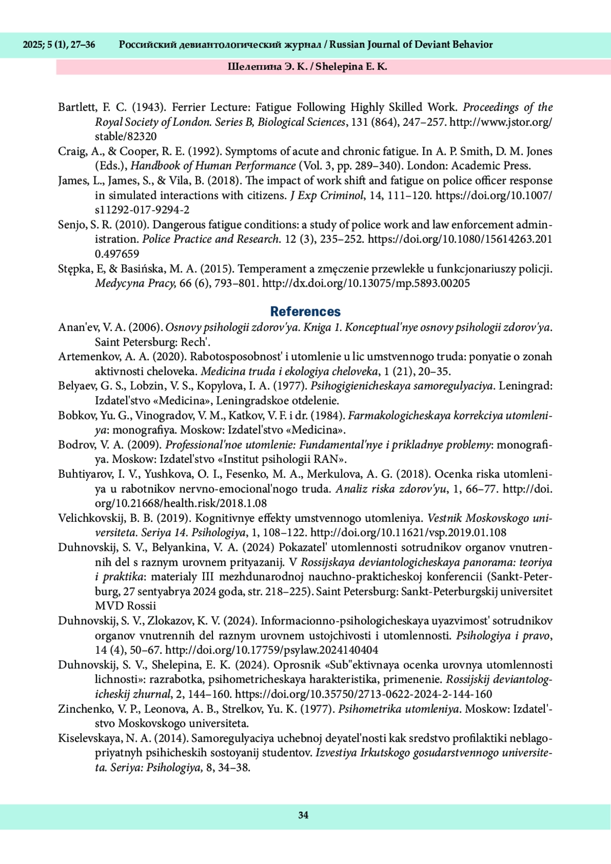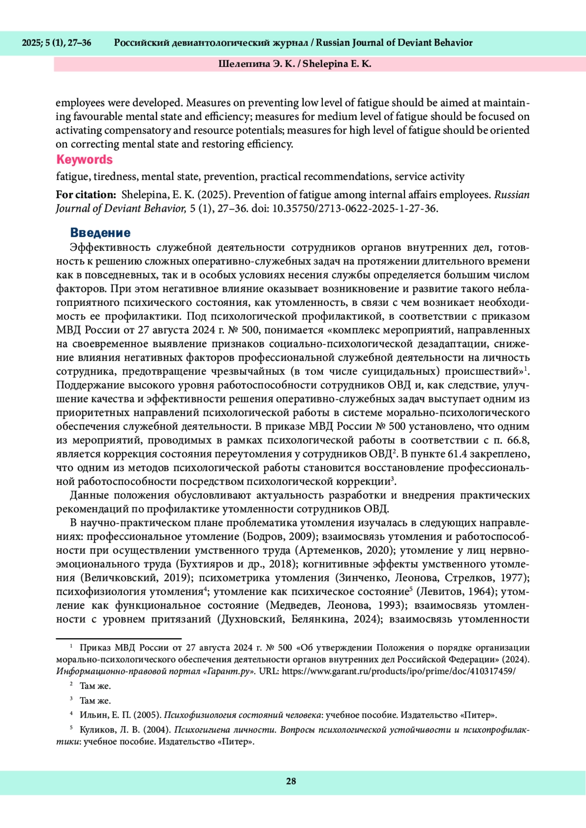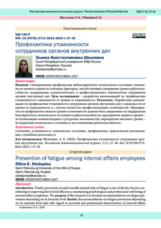 22. Шелепина, Э. К. (2025в). Утомленность, психическое состояние и настроение сотрудников органов внутренних дел. Прикладная психология и педагогика, 10 (1), 184-194. DOI: 10.12737/2500-0543-2025-10-1-184-194 E