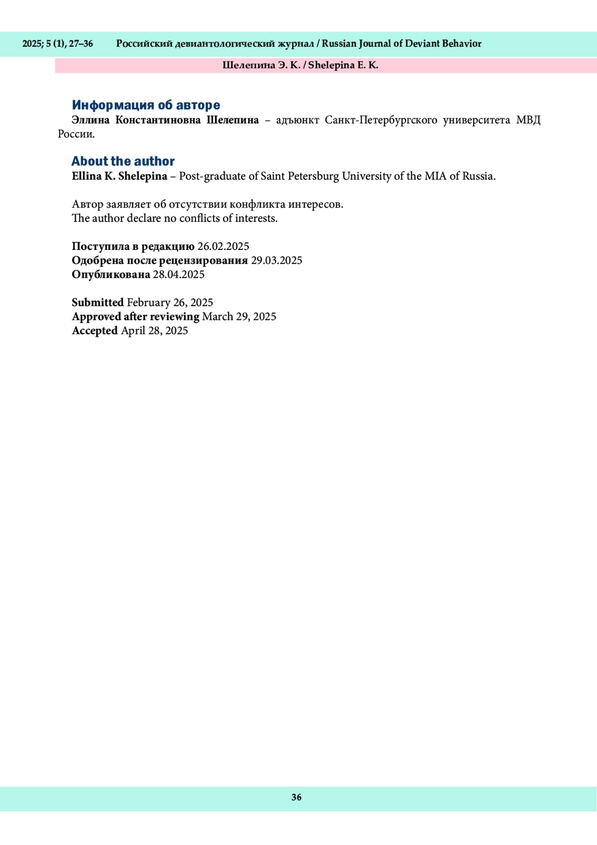 Данный номер открывает пятый год издания «Российского девиантологического журнала». За это время журнал включен в Перечень ВАК при Минобрнауки России, ему присвоена третья категория научной значимости (К3), индексация в Российском индексе научного цитирования демонстрирует стабильно высокие наукометрические показатели. Все это стало результатом эффективной работы редакционной коллегии, авторов, рецензентов, редакторов, а также читателей, которые проявляют интерес к материалам, изложенным в каждом номере.