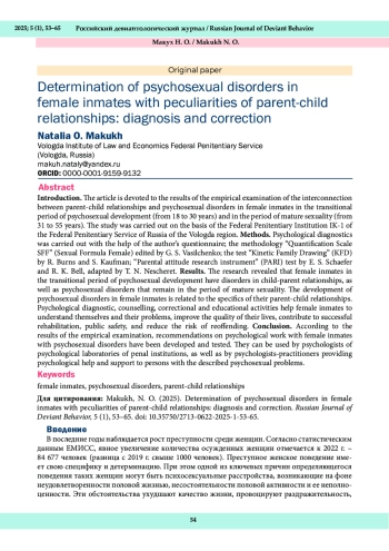 В представленной статье описаны результаты эмпирического исследования взаимосвязи детско-родительских отношений и психосексуальных расстройств у осужденных женщин в переходном периоде психосексуального развития (от 18 до 30 лет) и в периоде зрелой сексуальности (от 31 до 55 лет), проведенного на базе ФКУ ИК-1 УФСИН России по Вологодской области. Методы. Психологическая диагностика проводилась с помощью авторской анкеты; методики «Квантификационная шкала СФЖ» (сексуальная формула женская) под ред. Г. С. Васильченко; теста «Кинетический рисунок семьи» (КРС) Р. Бернса и С. Кауфмана; теста «Родительско-детские отношения» (РARI) Е. С. Шефера и Р. К. Белла, адаптированного Т. Н. Нещерет. Результаты. В ходе исследования выявлено, что у осужденных женщин в переходном периоде психосексуального развития присутствуют нарушения в детскородительских отношениях, а также психосексуальные расстройства, которые сохраняются в периоде зрелой сексуальности. Развитие психосексуальных расстройств у осужденных женщин связано с особенностями их детско-родительских отношений. Проведение психологических диагностических, консультативных, коррекционных и просветительских мероприятий помогает осужденным женщинам понять себя и свои проблемы, улучшить качество их жизни, способствует успешной реабилитации, общественной безопасности, а также снижает риск рецидива преступлений. Заключение. По результатам эмпирического исследования разработаны и апробированы рекомендации по психологической работе с осужденными женщинами, имеющими психосексуальные расстройства. Они могут быть использованы психологами психологических лабораторий учреждений уголовно-исполнительной системы, а также психологами-практиками, оказывающими психологическую помощь и поддержку лицам, имеющим описанные психосексуальные проблемы.