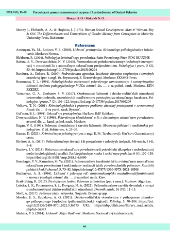 3. Бабина, С. В., Дворянчиков, Н. В. (2015). Возможности психокоррекционных лечебных мероприятий в отношении лиц с аномальным сексуальным предпочтением. Психология и право, 5 (2), 53-66. DOI: 10.17759/psylaw.2015100204