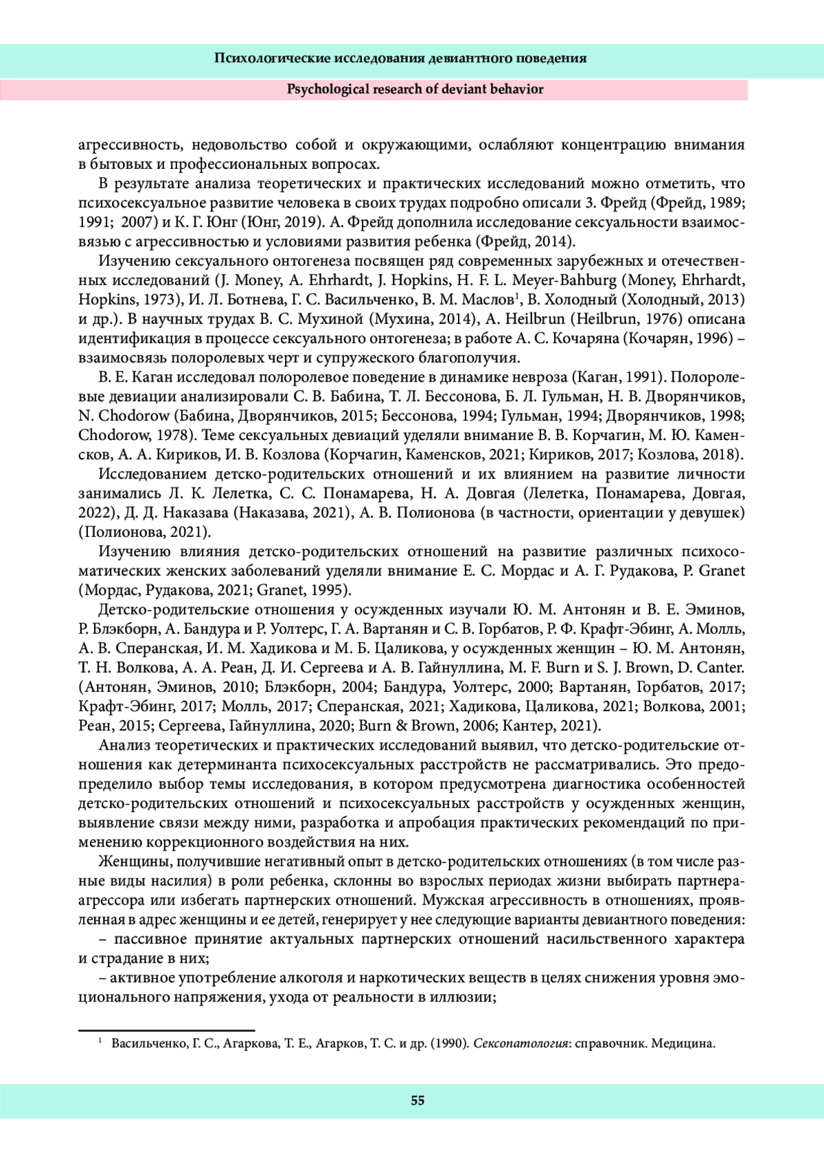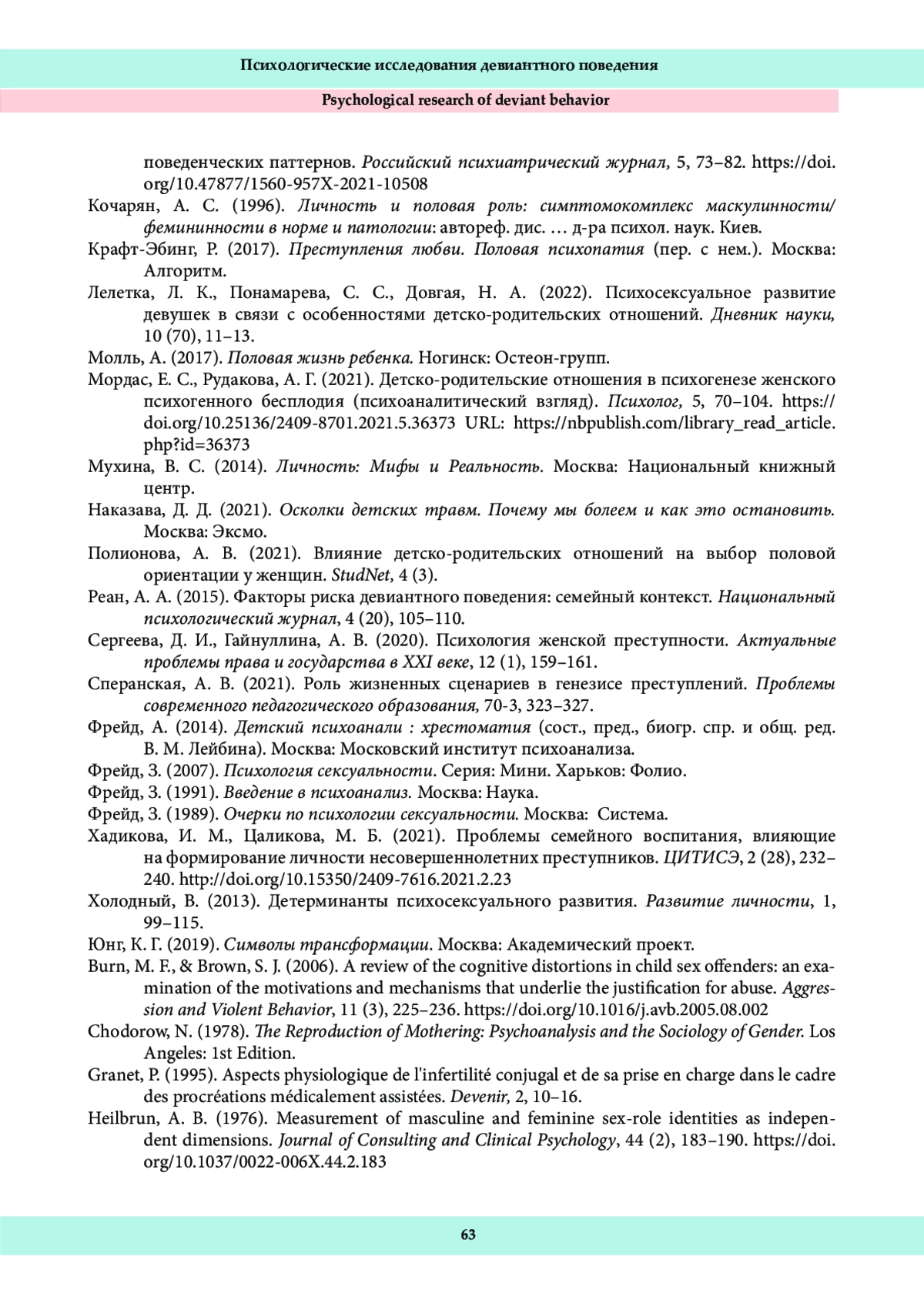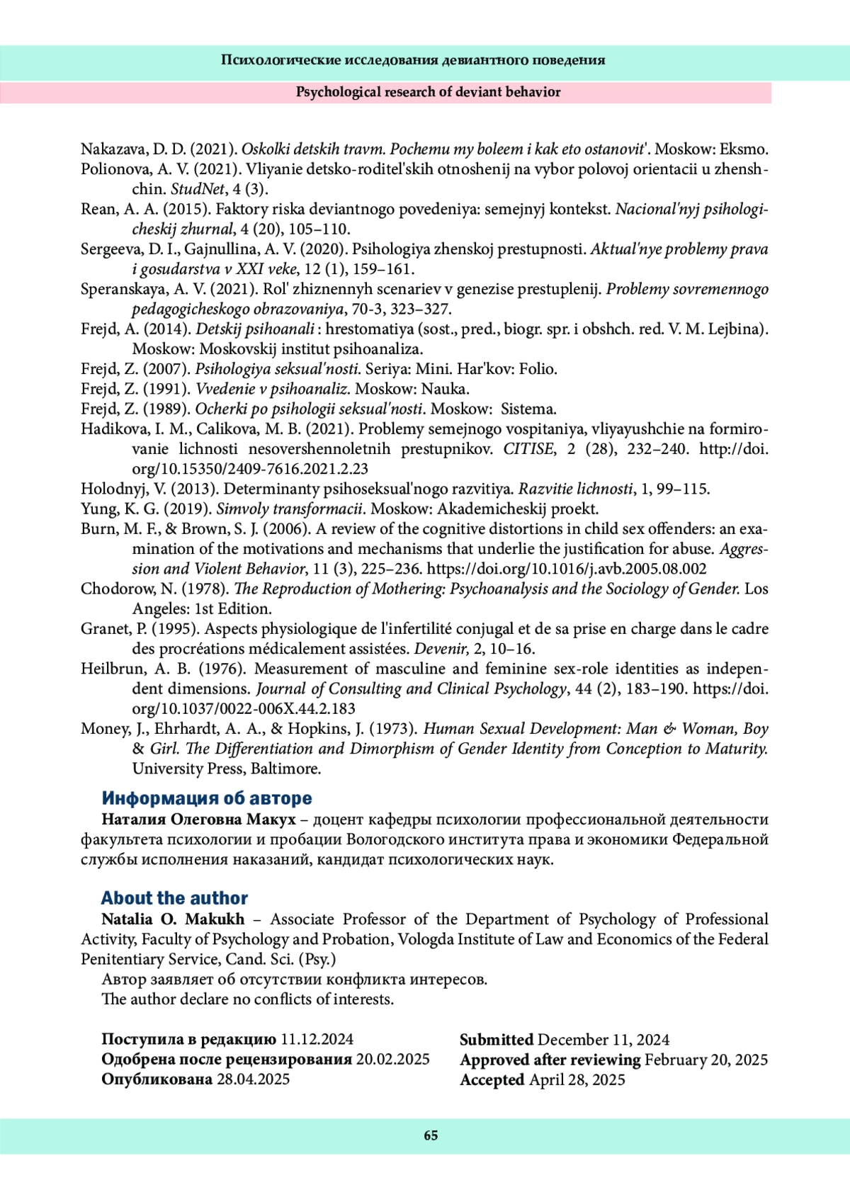 24. Сергеева, Д. И., Гайнуллина, А. В. (2020). Психология женской преступности. Актуальные проблемы права и государства в XXI веке, 12 (1), 159-161.