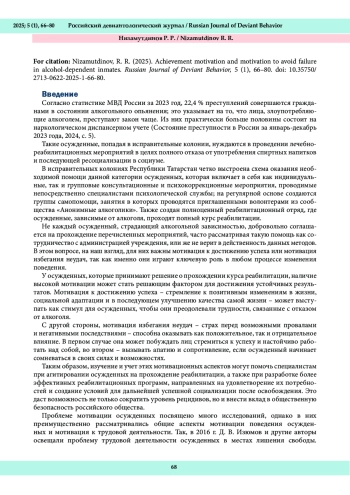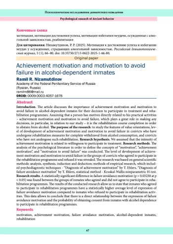 В статье обсуждается значимость мотивации к достижению успеха и избеганию неудач у осужденных, страдающих алкогольной зависимостью, для принятия ими решения об участии в лечебно-реабилитационных программах. У человека имеются мотивы, которые непосредственно связаны с его практической деятельностью, – это мотивация к достижению успеха и избеганию неудач, играющая важную роль в принятии каких-либо решений. Применительно к нашему исследованию – это прохождение курса реабилитации в целях полного отказа от алкоголя. Цель исследования: изучить особенности ценностных ориентаций, уровня сформированности мотивации к достижению успеха и избеганию неудач у осужденных, прошедших реабилитационные мероприятия по полному отказу от употребления алкоголя, и осужденных, кто не проходил данную реабилитацию. Гипотеза исследования. Мы предполагали, что выраженность мотивации к достижению успеха связана с желанием участвовать в лечении. Методы исследования. Проведен анализ психологической литературы в целях определения понятий «мотивация», «мотивация к достижению успеха», «мотивация избегания неудач». Выявлен уровень сформированности мотивации к достижению успеха и мотивации избегания неудач в группах осужденных, давших согласие на участие в программе реабилитации и отказавшихся от нее. Основу исследования составили общенаучные методы: анализ, синтез, индукция и дедукция; методы эмпирического исследования, куда вошли психодиагностические методики – «Диагностика мотивации достижения успеха» Т. Элерса, «Диагностика мотивации избегания неудач» Т. Элерса, статистический метод – непараметрический критерий Н-test Крускала-Уоллиса. Результаты исследования. Установлено статистически достоверное различие в мотивации избегания неудач (p = 0,03238 при p < 0,05) между группами осужденных, согласившихся и не согласившихся принять участие в реабилитационных программах. Результаты проведенного исследования позволяют утверждать, что у осужденных, согласившихся принять участие в реабилитационных программах, статистически выше средний уровень выраженности мотивации избегания неудач по сравнению с осужденными, отказавшимися от проведения с ними реабилитационных мероприятий, из чего можно сделать вывод о прямой связи выраженности мотивации избегания неудач и вероятности получения согласия от оосужденных, имеющих алкогольную зависимость, на участие в реабилитационных программах.