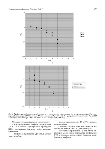 В работе рассмотрены процессы образования термодоноров (ТД) и термоакцепторов (ТА) в кремнии с низкой концентрацией кислорода, выращенном методом бестигельной зонной плавки. Анализ результатов термообработок в диапазоне температур 400—1150 оС показывает, что основной вклад в образование ТД вносят атомы межузельного железа Fei. Вероятной причиной образования ТА являются атомы железа в положении замещения при высокотемпературной термообработке (ВТО) и преципитаты железa, образующиеся при низкотемпературных отжигах (НТО) (400— 600 оC). Концентрации ТД и ТА после ВТО зависят от вида и плотности структурных дефектов в материале (линейных дислокаций и микродефектов) и условий ТО: скорости охлаждения и газовой среды (кислород, аргон).