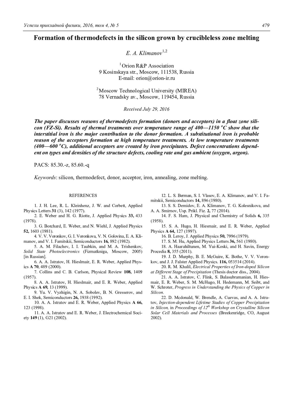 6. Istratov A. A., Hieslmair H., Weber E. R. // Applied Physics. 2000. Vol. A 70. P. 489.