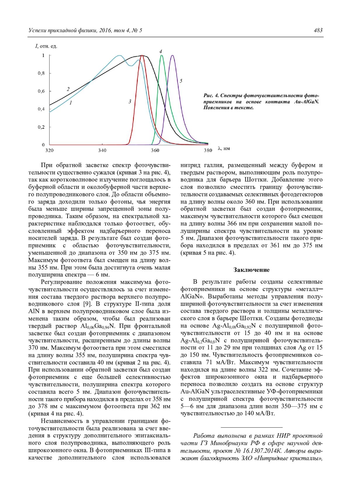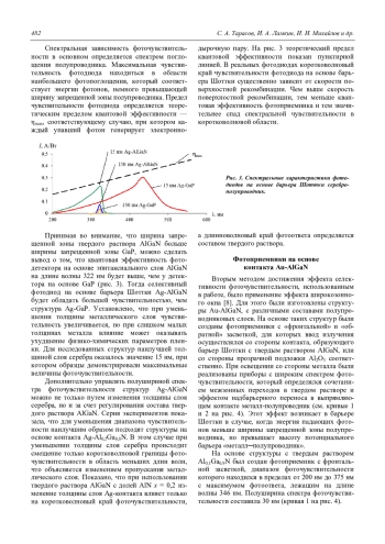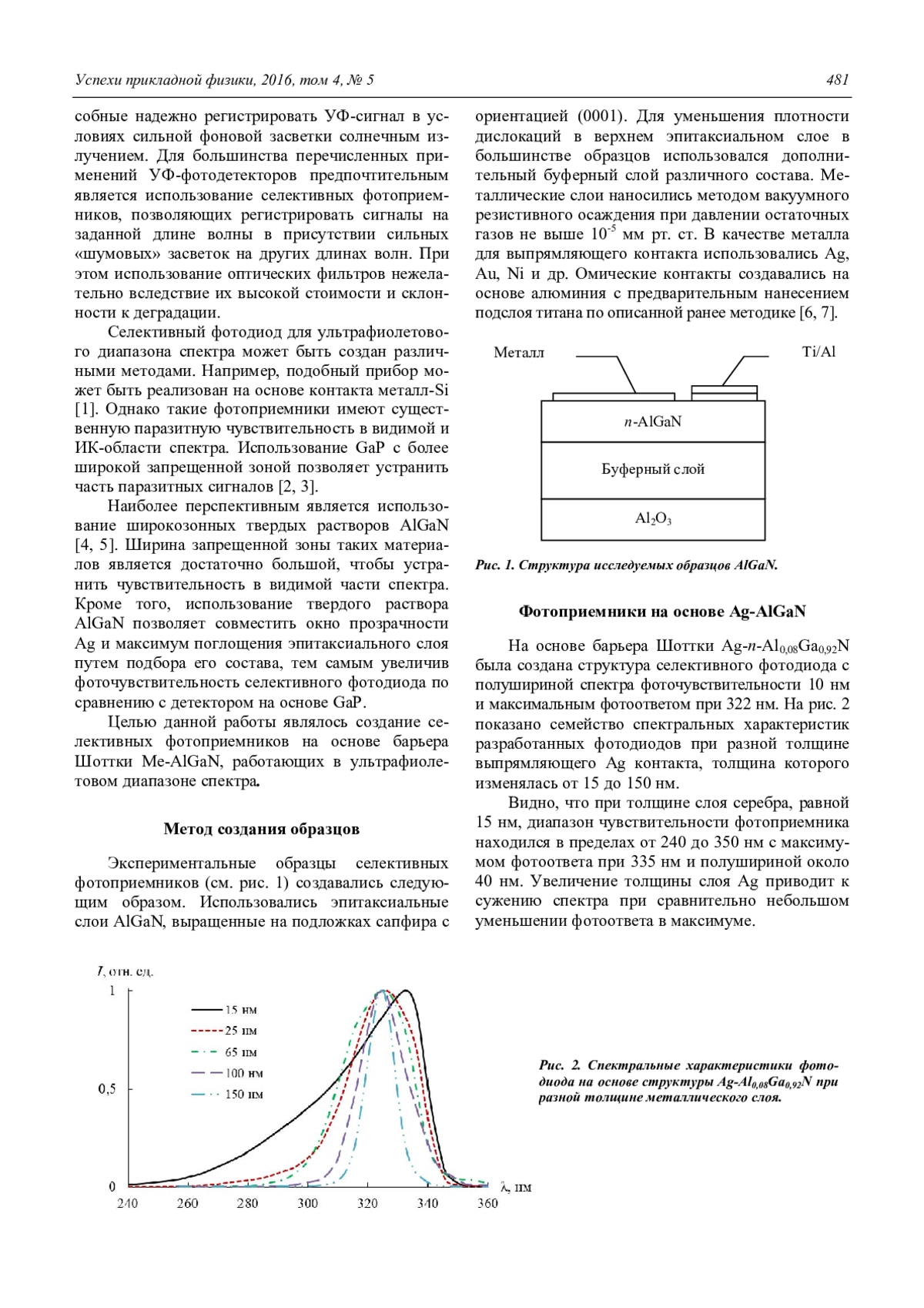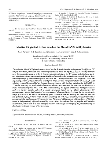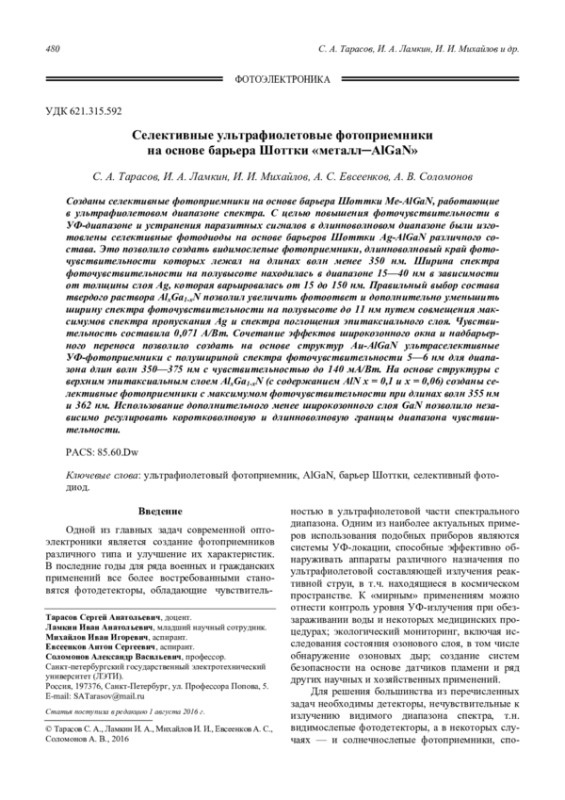 Созданы селективные фотоприемники на основе барьера Шоттки Ме-AlGaN, работающие в ультрафиолетовом диапазоне спектра. С целью повышения фоточувствительности в УФ-диапазоне и устранения паразитных сигналов в длинноволновом диапазоне были изготовлены селективные фотодиоды на основе барьеров Шоттки Ag-AlGaN различного состава. Это позволило создать видимослепые фотоприемники, длинноволновый край фоточувствительности которых лежал на длинах волн менее 350 нм. Ширина спектра фоточувствительности на полувысоте находилась в диапазоне 15—40 нм в зависимости от толщины слоя Ag, которая варьировалась от 15 до 150 нм. Правильный выбор состава твердого раствора AlxGa1-xN позволил увеличить фотоответ и дополнительно уменьшить ширину спектра фоточувствительности на полувысоте до 11 нм путем совмещения максимумов спектра пропускания Ag и спектра поглощения эпитаксиального слоя. Чувствительность составила 0,071 А/Вт. Сочетание эффектов широкозонного окна и надбарьерного переноса позволило создать на основе структур Au-AlGaN ультраселективные УФ-фотоприемники с полушириной спектра фоточувствительности 5—6 нм для диапазона длин волн 350—375 нм с чувствительностью до 140 мА/Вт. На основе структуры с верхним эпитаксиальным слоем AlxGa1-xN (с содержанием AlN x = 0,1 и x = 0,06) созданы селективные фотоприемники с максимумом фоточувствительности при длинах волн 355 нм и 362 нм. Использование дополнительного менее широкозонного слоя GaN позволило независимо регулировать коротковолновую и длинноволновую границы диапазона чувствиительности.