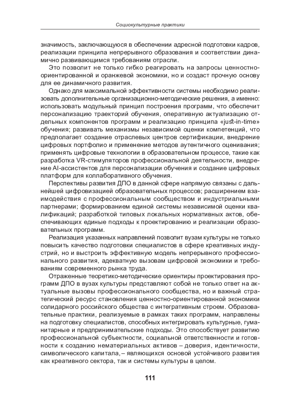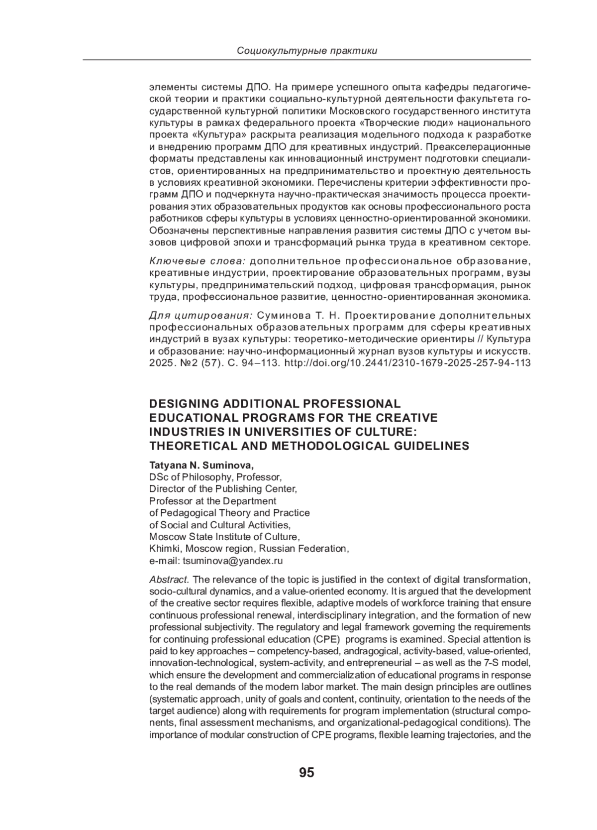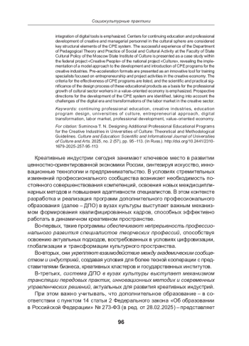 Актуальность темы обоснована в контексте цифровой трансформации, социокультурной динамики и ценностно ориентированной экономики. Утверждается, что развитие креативного сектора требует гибких, адаптивных моделей подготовки кадров, обеспечивающих постоянное профессиональное обновление, междисциплинарную интеграцию и формирование новой профессиональной субъектности. Рассмотрены нормативно правовые основы, регламентирующие требования к программам дополнительного профессионального образования (ДПО). Особое внимание уделено ключевым подходам компетентностному, андрагогическому, деятельностному, ценностно ориентированному, инновационно технологическому, системно деятельностному и предпринимательскому, а также модели 7 S, обеспечивающим разработку и коммерциализацию образовательных программ в условиях реальных запросов современного рынка труда. Обозначены основные принципы проектирования (системность, единство целей и содержания, преемственность, ориентация на потребности целевой аудитории) и требования к реализации программ (структурные компоненты, механизмы итоговой аттестации и организационно педагогические условия). Подчеркнута значимость модульного построения программ ДПО, гибких траекторий обучения и интеграции цифровых инструментов. Центры непрерывного образования и повышения квалификации творческих и управленческих кадров в сфере культуры рассмотрены как ключевые структурные элементы системы ДПО. На примере успешного опыта кафедры педагогической теории и практики социально культурной деятельности факультета государственной культурной политики Московского государственного института культуры в рамках федерального проекта «Творческие люди» национального проекта «Культура» раскрыта реализация модельного подхода к разработке и внедрению программ ДПО для креативных индустрий. Преакселерационные форматы представлены как инновационный инструмент подготовки специалистов, ориентированных на предпринимательство и проектную деятельность в условиях креативной экономики. Перечислены критерии эффективности программ ДПО и подчеркнута научно практическая значимость процесса проектирования этих образовательных продуктов как основы профессионального роста работников сферы культуры в условиях ценностно ориентированной экономики. Обозначены перспективные направления развития системы ДПО с учетом вызовов цифровой эпохи и трансформаций рынка труда в креативном секторе.
