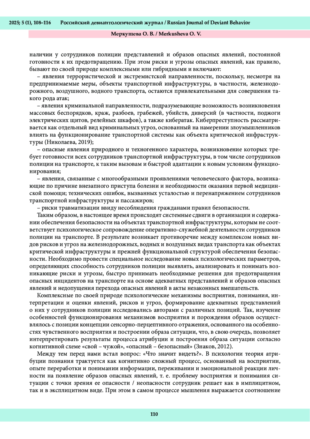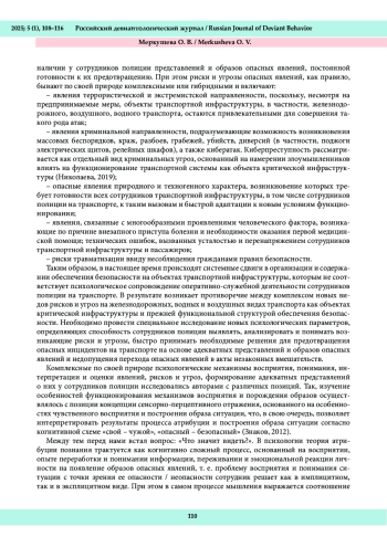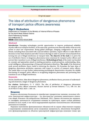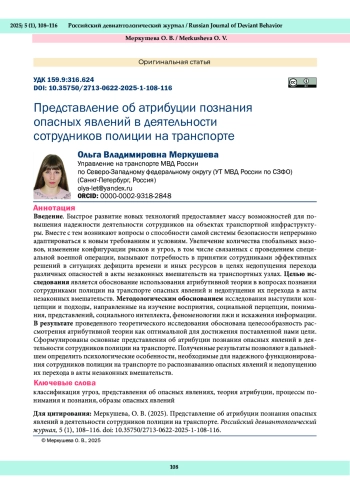 Быстрое развитие новых технологий предоставляет массу возможностей для повышения надежности деятельности сотрудников на объектах транспортной инфраструктуры. Вместе с тем возникают вопросы о способности самой системы безопасности непрерывно адаптироваться к новым требованиям и условиям. Увеличение количества глобальных вызовов, изменение конфигурации рисков и угроз, в том числе связанных с проведением специальной военной операции, вызывают потребность в принятии сотрудниками эффективных решений в ситуациях дефицита времени и иных ресурсов в целях недопущения перехода различных опасностей в акты незаконных вмешательств на транспортных узлах. Целью исследования является обоснование использования атрибутивной теории в вопросах познания сотрудниками полиции на транспорте опасных явлений и недопущения их перехода в акты незаконных вмешательств. Методологическим обоснованием исследования выступили концепции и подходы, направленные на изучение восприятия, социальной перцепции, понимания, представлений, социального интеллекта, феноменологии лжи и искажения информации. В результате проведенного теоретического исследования обоснована целесообразность рассмотрения атрибутивной теории как оптимальной для достижения поставленной нами цели. Сформулированы основные представления об атрибуции познания опасных явлений в деятельности сотрудников полиции на транспорте. Полученные результаты позволяют в дальнейшем определить психологические особенности, необходимые для надежного функционирования сотрудников полиции на транспорте по распознаванию опасных явлений и недопущению их перехода в акты незаконных вмешательств.
