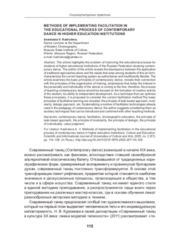В статье актуализируется проблема совершенствования образовательного процесса для студентов высших учебных заведений Российской федерации, обучающихся современному танцу. Автор статьи раскрывает несоответствие применения одних только традиционных подходов к потребностям, которые возникают у обучающихся этому виду искусства; он характеризует сложившуюся систему преподавания как авторитарную и недостаточно гибкую. В статье рассматриваются базовые принципы современного танца, раскрывается их связь с принципами организации обучения, подчеркивается, что сегодня на первый план выдвигается интерес к личности и индивидуальности танцовщика, поэтому процесс обучения современному танцу должен быть ориентирован на формирование творческой активности ученика, его способности к самостоятельному развитию. В качестве приема, который может оптимизировать эти процессы, предлагается рассмотреть актуальный сегодня метод фасилитации. Раскрываются основные принципы фасилитативного обучения: принцип задачности, модульности, диалогичности и др. Систематизируя ряд технологий фасилитации, уже применяемых в педагогике современного танца, автор предлагает рассматривать их как вспомогательные техники, которые могут внедрятся и комбинироваться с другими методами преподавания.