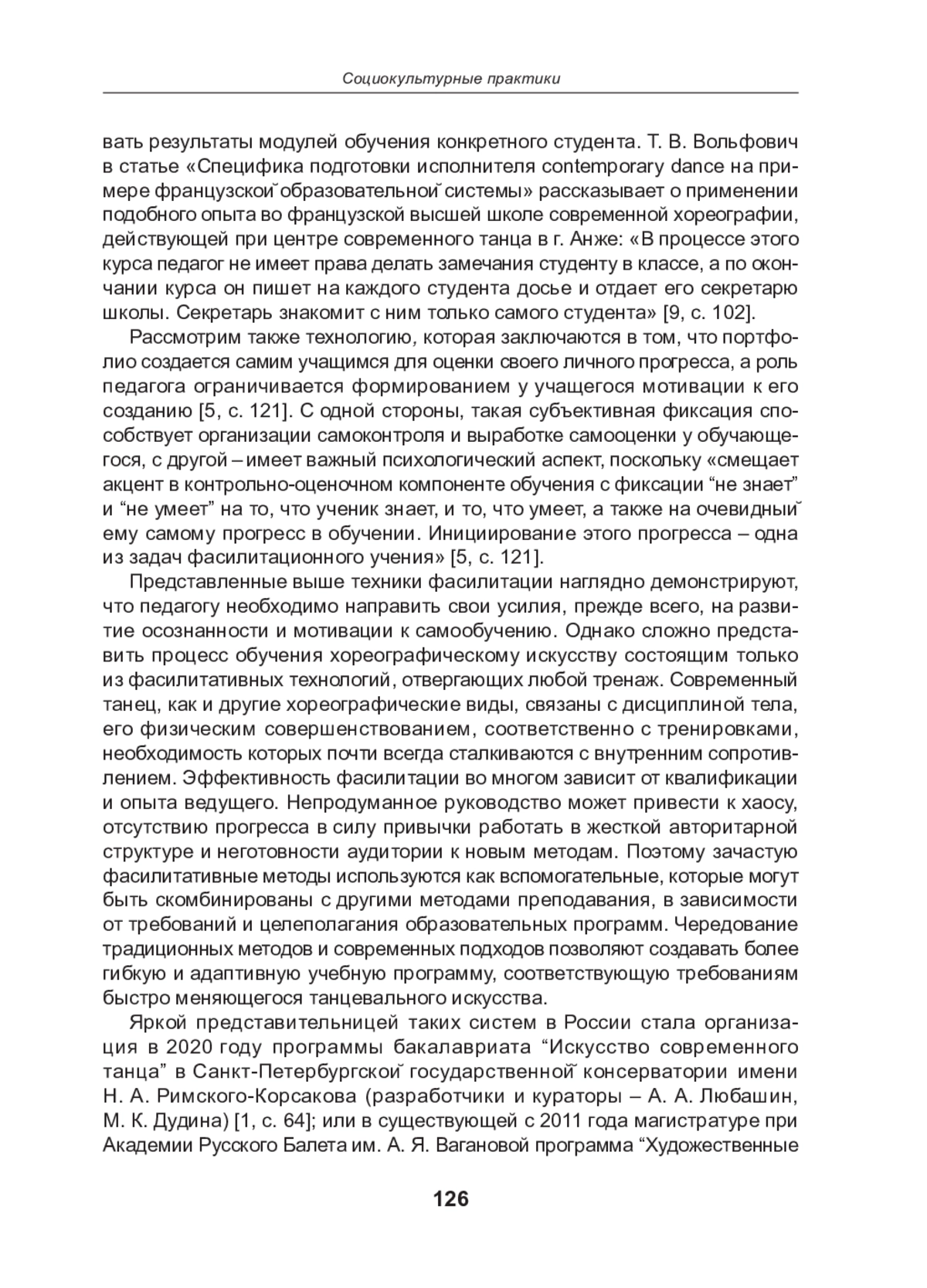9. Вольфович Т. В. Специфика подготовки исполнителя contemporary dance на примере французской образовательной системы: теория и практика // Танцевальная педагогика будущего: теория и практика: материалы международной научно практической конференции компании Dancehelp совместно с ГБУК г. Москвы “КЦ “Вдохновение”. Москва: РОСА, 2019. С. 100-105.