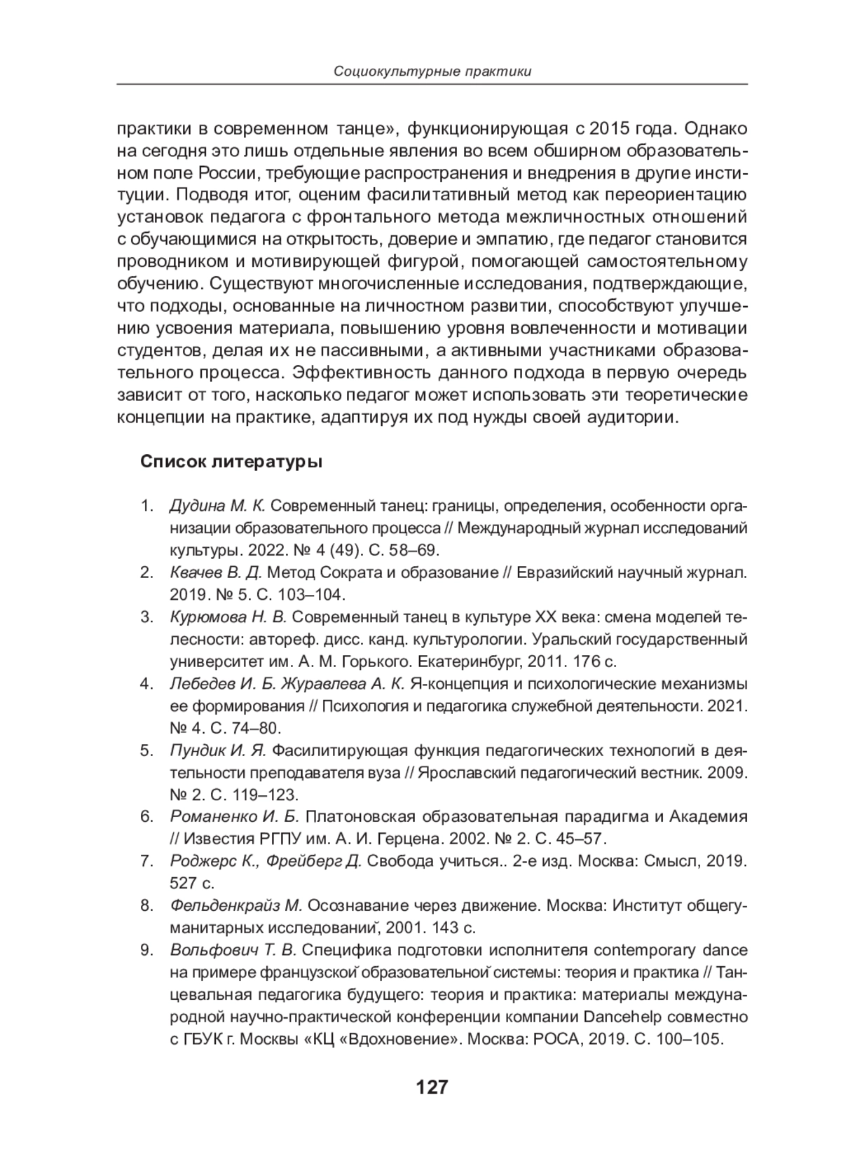 1. Дудина М. К. Современный танец: границы, определения, особенности организации образовательного процесса // Международный журнал исследований культуры. 2022. № 4 (49). С. 58-69. EDN: JRZCXW