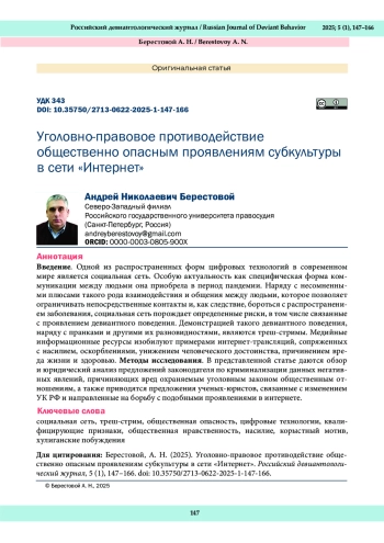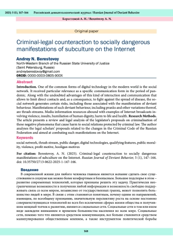 2. Берестовой, А. Н., Сысолина, Н. С. (2023). Вопросы криминализации девиантного поведения в сети Интернет. Философия права, 3 (106), 85-93.