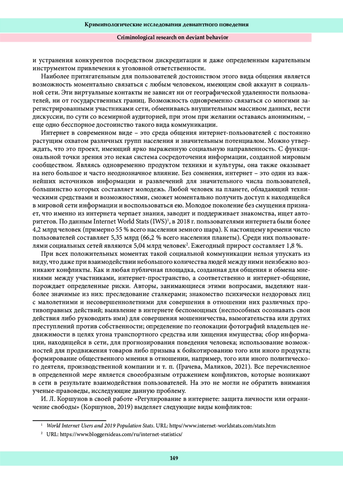 3. Грачева, Ю. В., Маликов, С. В. (2021). Треш-стрим: социальная обусловленность криминализации. Актуальные проблемы российского права, 16 (6), 202-210. DOI: 10.17803/19941471.2021.127.6.202-210