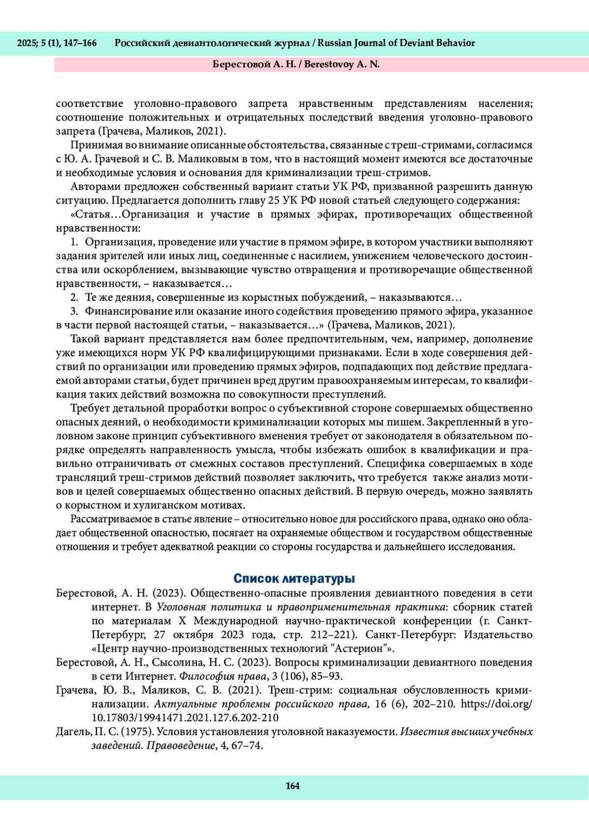 7. Капитонова, Е. А. (2024). Пранки, треш-стримы и другие новые формы девиантных действий, совершаемых в погоне за популярностью: проблемы квалификации. Уголовное право, 2 (162), 24-34.
