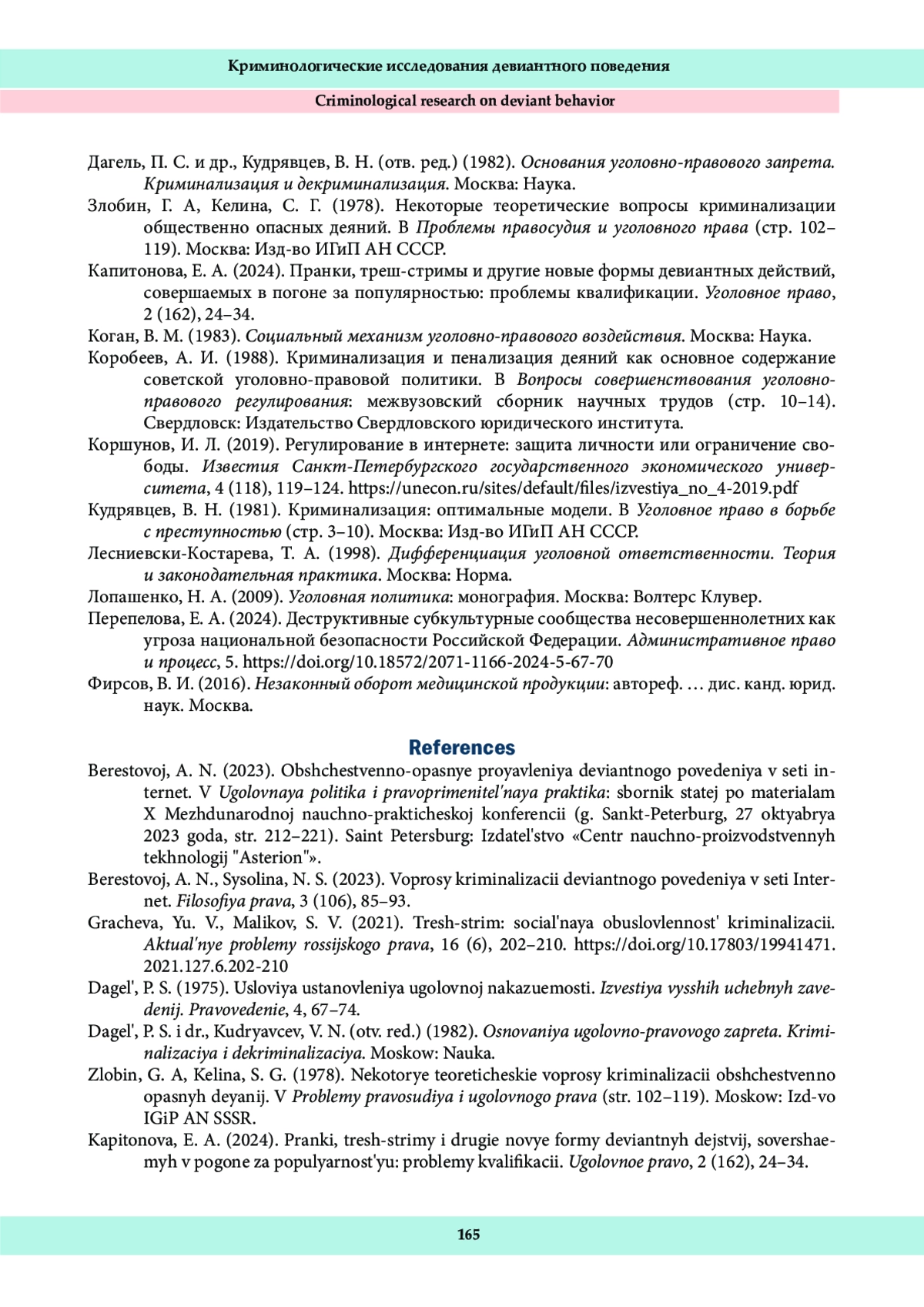 1. Берестовой, А. Н. (2023). Общественно-опасные проявления девиантного поведения в сети интернет. В Уголовная политика и правоприменительная практика: сборник статей по материалам Х Международной научно-практической конференции (г. Санкт-Петербург, 27 октября 2023 года, стр. 212-221). Санкт-Петербург: Издательство “Центр научно-производственных технологий “Астерион”.