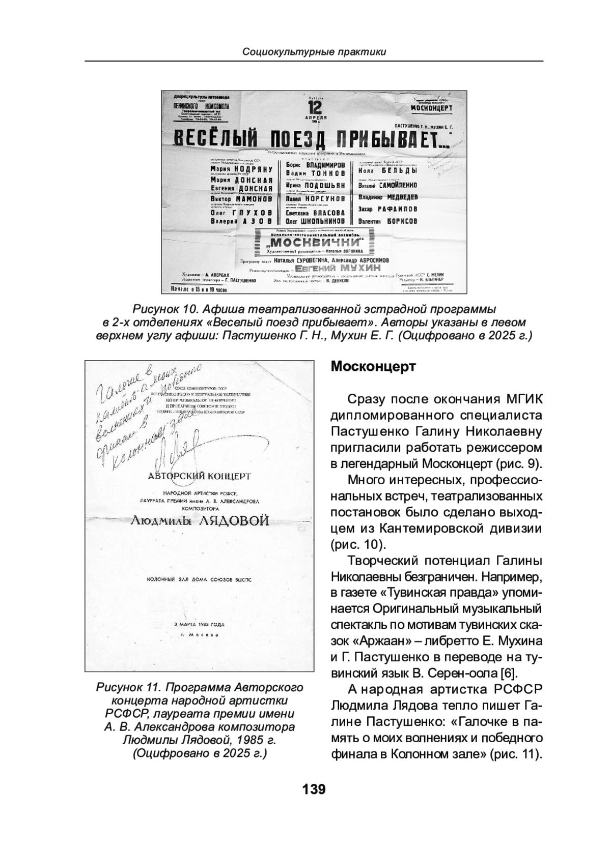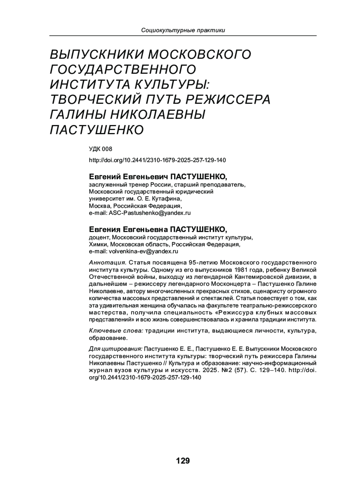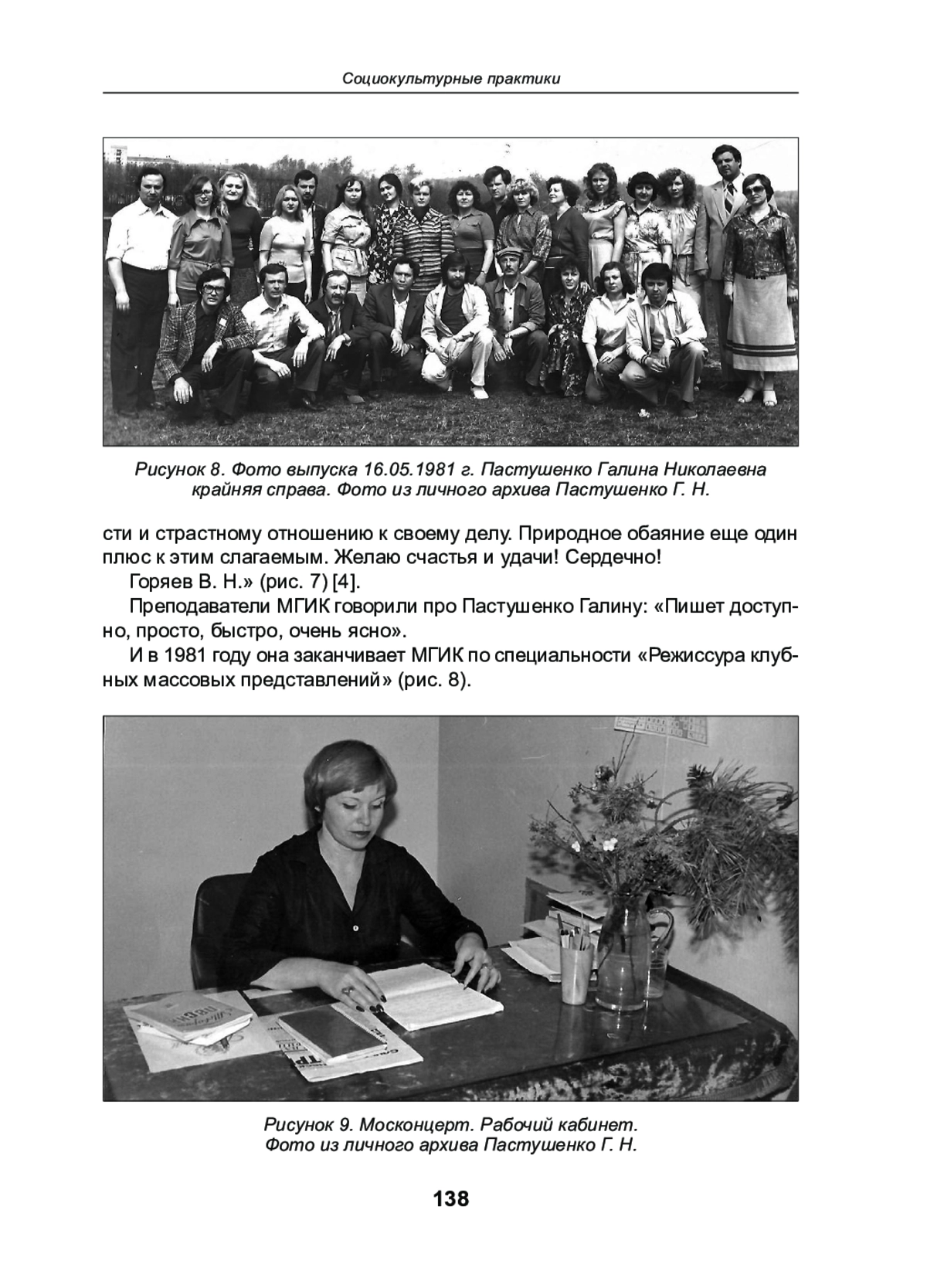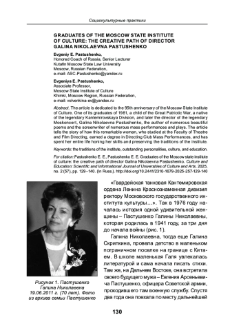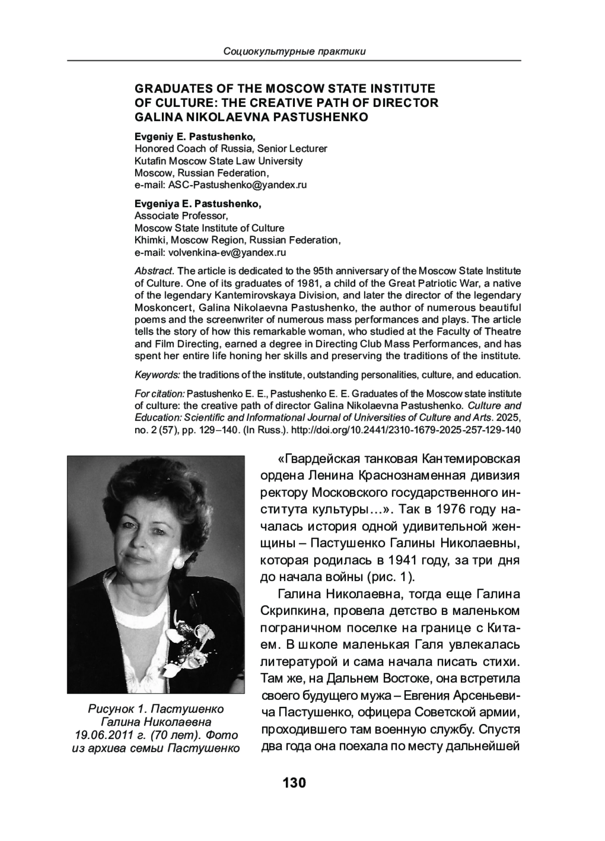 Статья посвящена 95 летию Московского государственного института культуры. Одному из его выпускников 1981 года, ребенку Великой Отечественной войны, выходцу из легендарной Кантемировской дивизии, в дальнейшем режиссеру легендарного Москонцерта Пастушенко Галине Николаевне, автору многочисленных прекрасных стихов, сценаристу огромного количества массовых представлений и спектаклей. Статья повествует о том, как эта удивительная женщина обучалась на факультете театрально режиссерского мастерства, получила специальность «Режиссура клубных массовых представлений» и всю жизнь совершенствовалась и хранила традиции института.