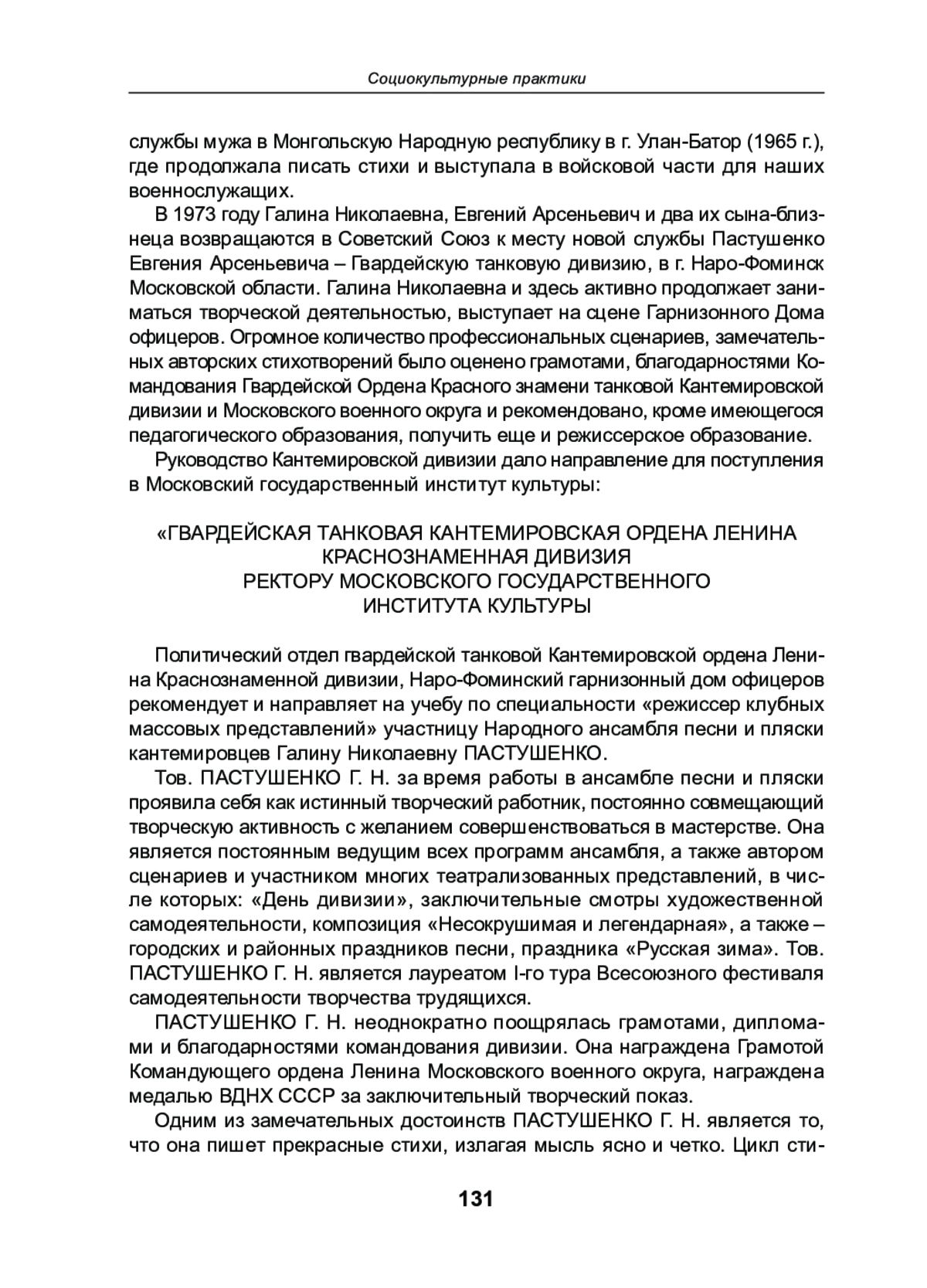 «Гвардейская танковая Кантемировская ордена Ленина Краснознаменная дивизия ректору Московского государственного института культуры…». Так в 1976 году началась история одной удивительной женщины – Пастушенко Галины Николаевны, которая родилась в 1941 году, за три дня до начала вой ны (рис. 1).