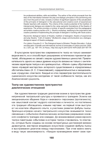 В данной статье рассматриваются тенденции разносторонней подготовки студентов к актерской деятельности в условиях заметной трансформации подходов к сущности и перспективам института театра. При этом основной акцент делается на диалогическом аспекте формирования творческой индивидуальности студента и развития его профессиональных способностей, навыков и умений. Автор статьи исходит из идеи взаимосвязи игрового и диалогического начал в сценическом искусстве и под этим углом зрения раскрывает ряд существенных моментов актуализации принципа диалогизма в учебно-творческой работе опытных театральных педагогов со студентами. Критерии творческого потенциала традиции межличностного диалога соотносятся с ценностно смысловыми основами театра переживания. В статье приводится ряд конкретных примеров из педагогической и художественно творческой практики мастерской Н. Л. Скорика, свидетельствующих о важности и творческой перспективность реализации принципа диалогизма в работе с будущими актерами.