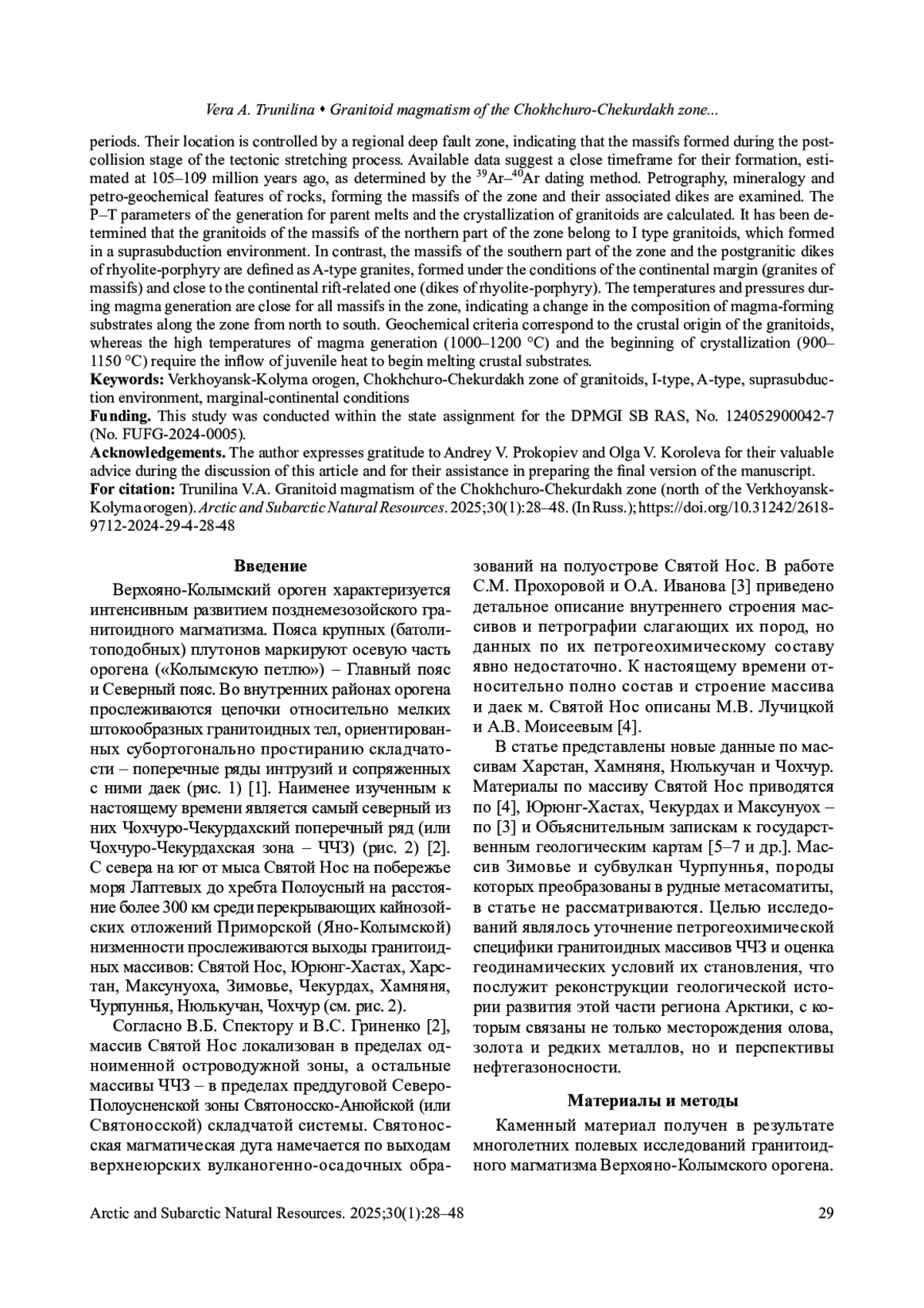 Представлены результаты исследований по мезозойскому интрузивному магматизму Чохчуро-Чекурдахской зоны (ЧЧЗ), протягивающейся в субмеридиональном направлении через всю Приморскую (Яно-Индигирскую) низменность от Бакынского массива Северного батолитового пояса на юге до мыса Святой Нос моря Лаптевых на севере. Гранитоидные массивы ЧЧЗ интрудируют складчатые толщи поздней юры и раннего мела, и их положение контролируется зоной регионального разлома, т. е. массивы сформированы в постколлизионный этап в результате процессов растяжения. Имеющиеся данные свидетельствуют о близком времени их становления (105–109 млн лет – 40Ar–39Ar-метод). Рассмотрены петрография, минералогия и петрогеохимические особенности пород, слагающих массивы и сопровождающих их даек, определены Р–Т-параметры генерации материнских расплавов и кристаллизации гранитоидов. Установлена принадлежность гранитоидов массивов северной части зоны к гранитоидам I-типа, формировавшимся в надсубдукционной обстановке, а массивов южной части зоны и постгранитных даек риолит-порфиров – к гранитам А-типа, сформированным в обстановке континентальной окраины (граниты массивов) и близкой к континентально-рифтогенной (дайки риолит-порфиров). Температуры и давления при магмогенерации для всех массивов зоны близки, что указывает на смену состава магмообразующих субстратов вдоль зоны с севера на юг. Геохимические характеристики свидетельствуют о коровом происхождении гранитоидов, тогда как высокие температуры магмогенерации (1000–1200 °С) и начала кристаллизации (900–1150 °С) требуют поступления ювенильного тепла для начала плавления коровых субстратов.