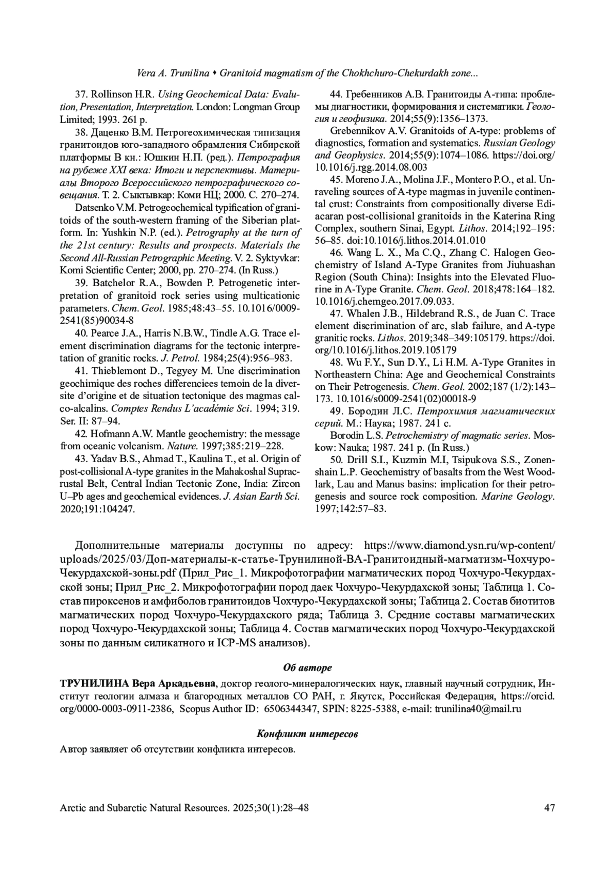 47. Whalen J.B., Hildebrand R.S., de Juan C. Trace element discrimination of arc, slab failure, and A-type granitic rocks. Lithos. 2019;348-349:105179. DOI: 10.1016/j.lithos.2019.105179