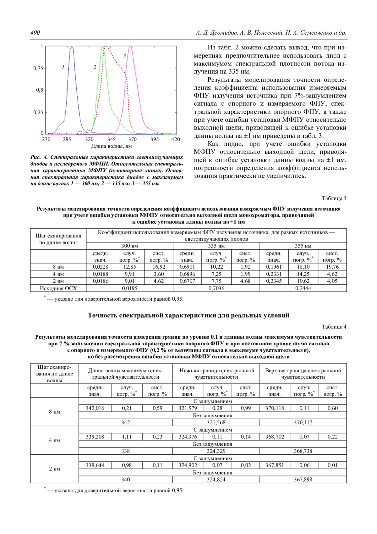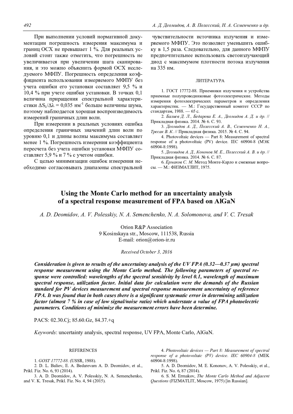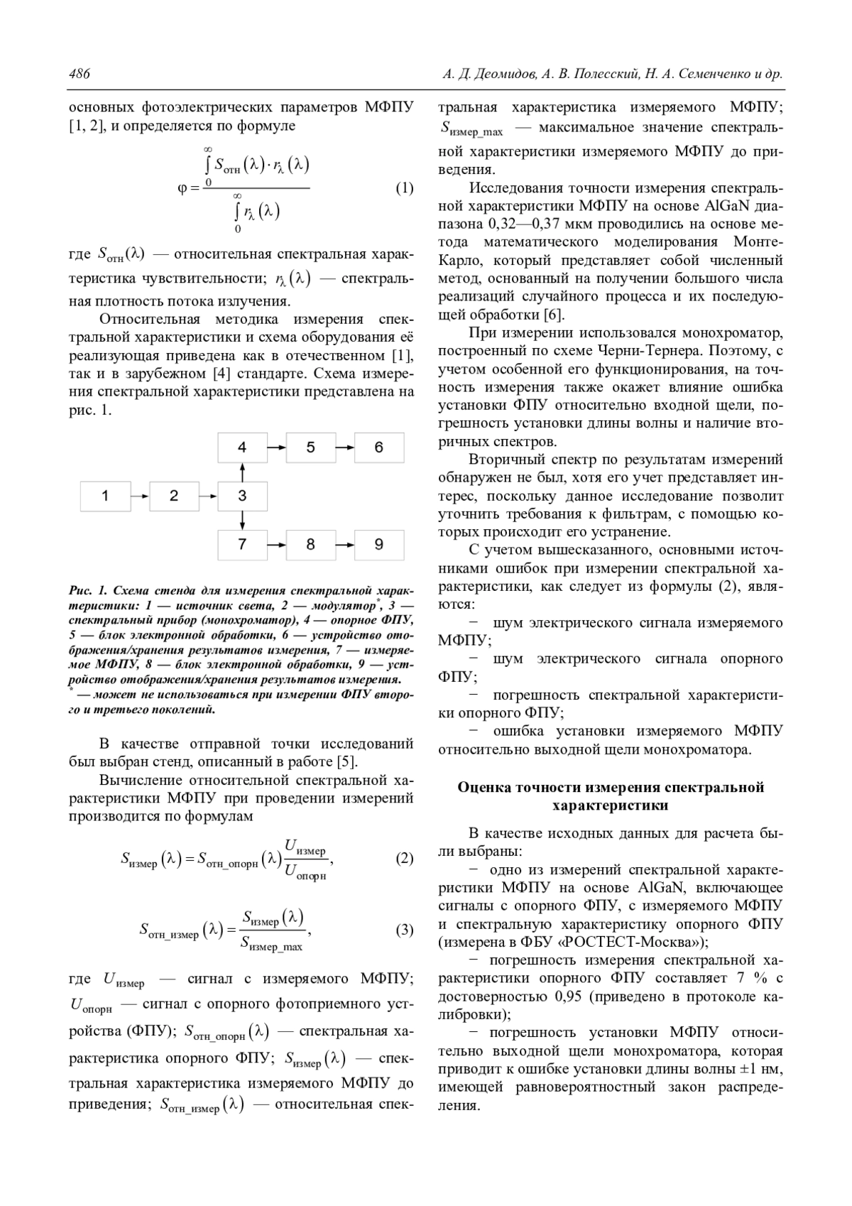 Деомидов А. Д., Полесский А. В., Семенченко Н. А., Соломонова Н. А., Тресак В. К. Исследование точности измерения спектральной характеристики видимо-слепого фотоприемника на основе AlGaN методом Монте-Карло 485