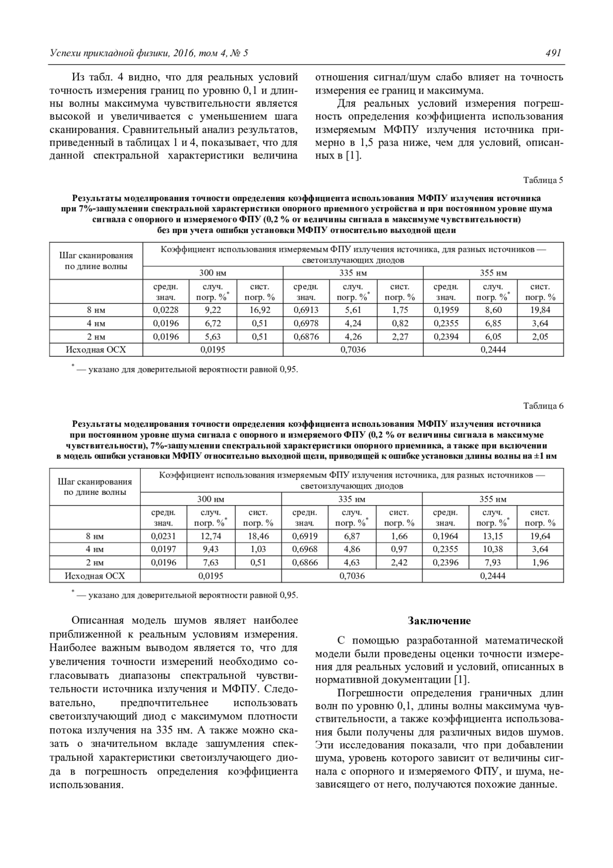 Погрешности определения граничных длин волн по уровню 0,1, длины волны максимума чувствительности, а также коэффициента использования были получены для различных видов шумов. Эти исследования показали, что при добавлении шума, уровень которого зависит от величины сигнала с опорного и измеряемого ФПУ, и шума, независящего от него, получаются похожие данные.
