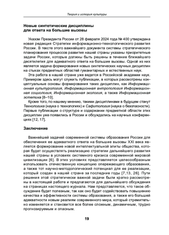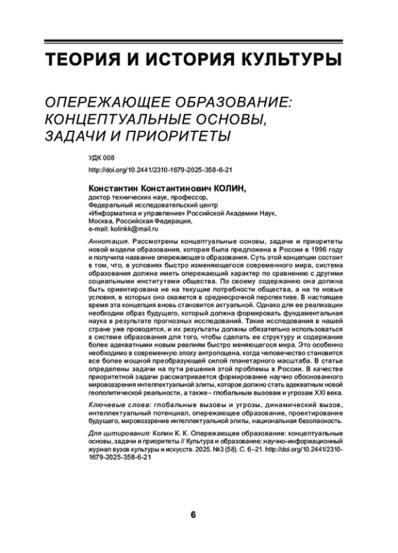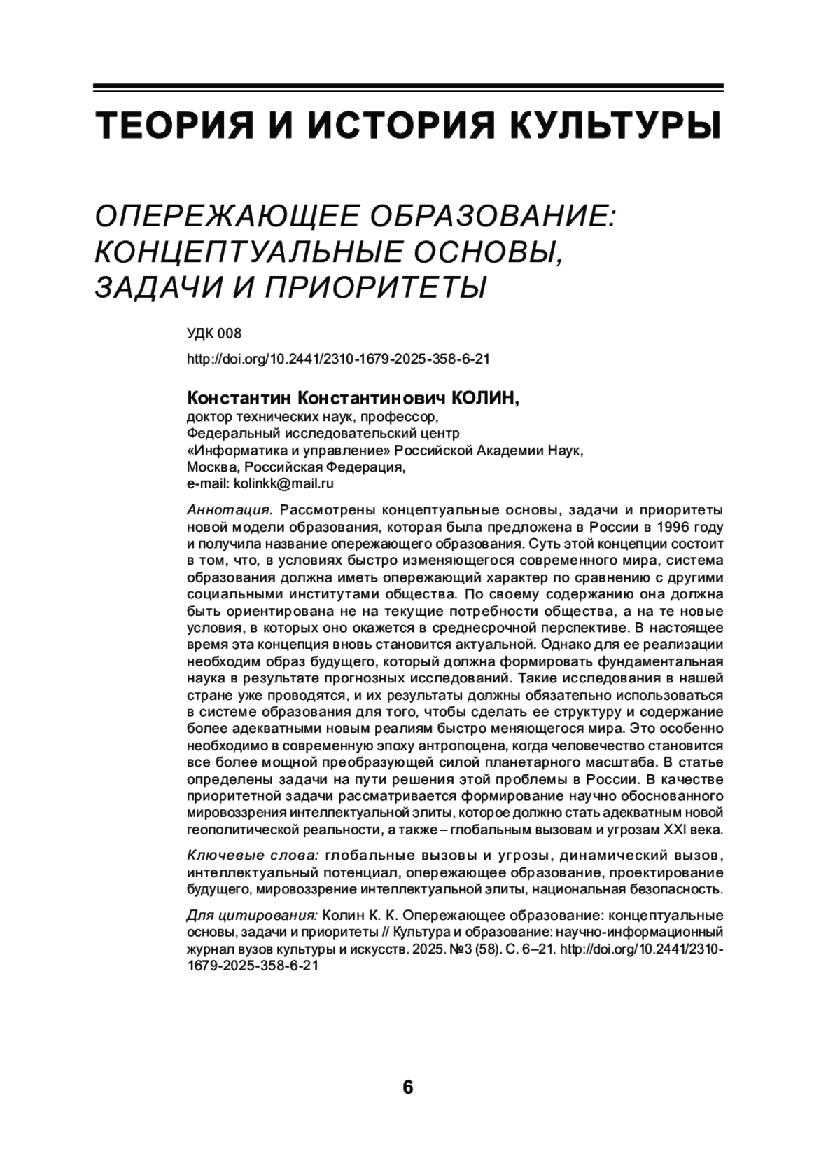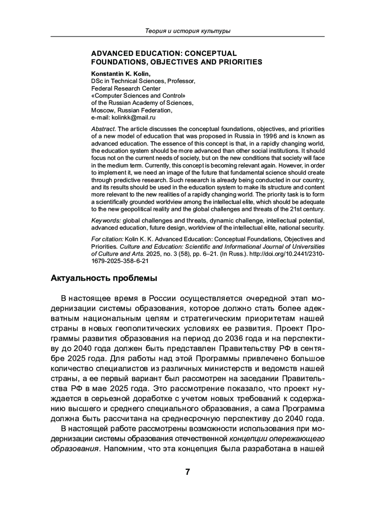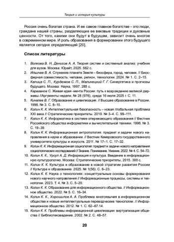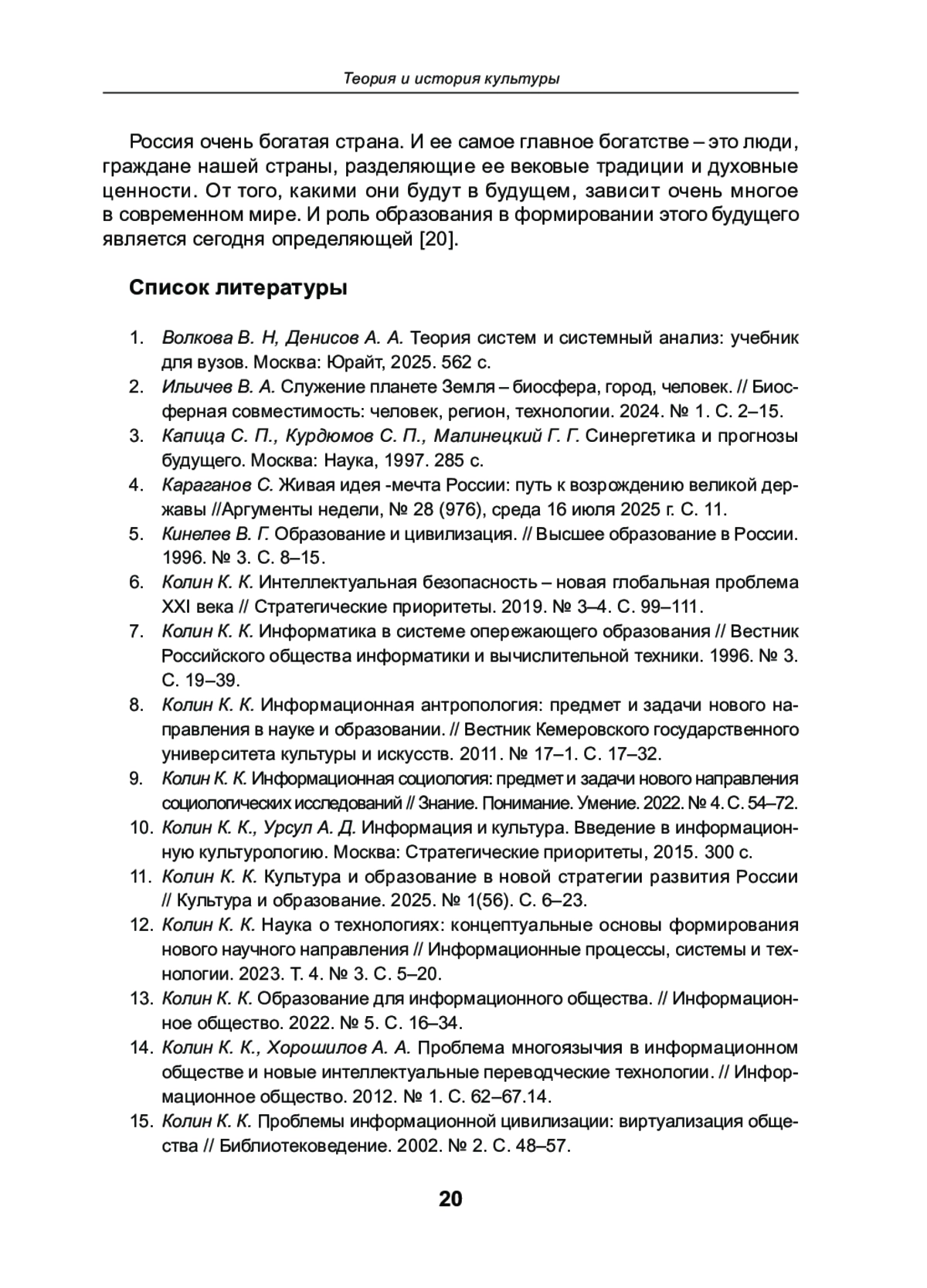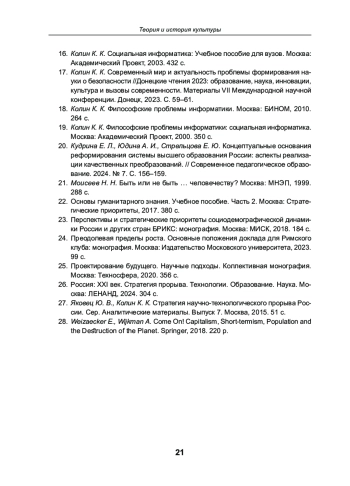 11. Колин К. К. Культура и образование в новой стратегии развития России // Культура и образование. 2025. № 1(56). С. 6-23. EDN: DZJSHL